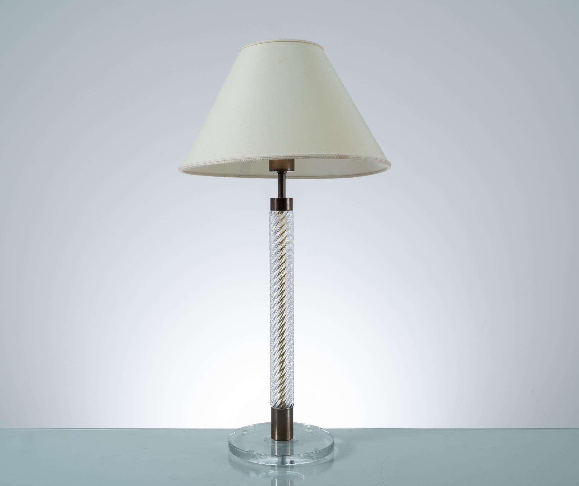 Lampada da tavolo ad una luce struttura in ottone con fusto in vetro incolore trasparente a torchon, ottone lucido, base circolare in vetro, diffusore in tessuto avorio. Firma a graffio Salviati.