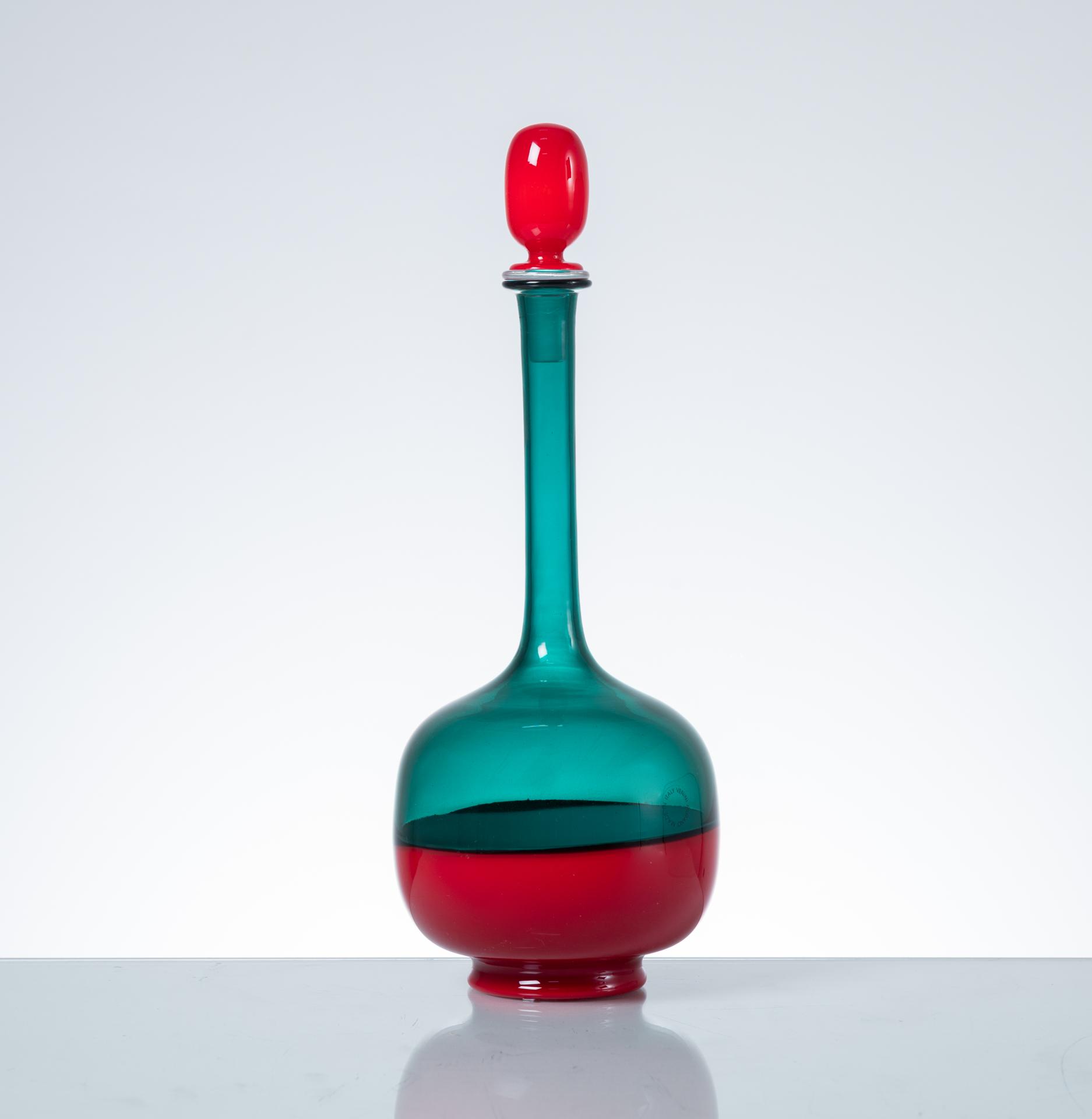 Bottiglia della serie “Morandiane” (disegno del 1946) in vetro soffiato verde lavorato ad incalmo con fascia in pasta vitrea rossa, corpo sferico con lungo collo e bocca circolare piana con tappo. Firma all’acido "Venini Murano Italia 1985".