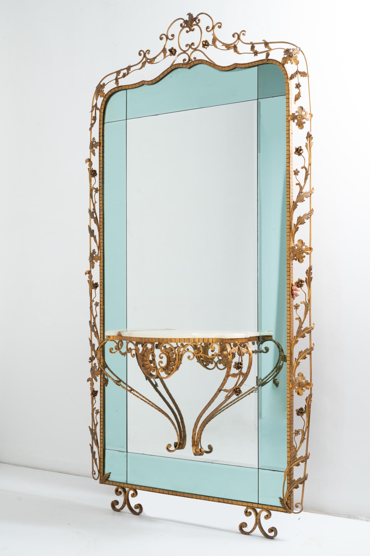 Grande specchiera modello “Fiori”, struttura in ferro dorato, cristallo specchiato e cristallo specchiato colorato, consolle in ferro dorato con piano sagomato in marmo. Filatura al vetro sotto la consolle e incollatura al marmo del piano.