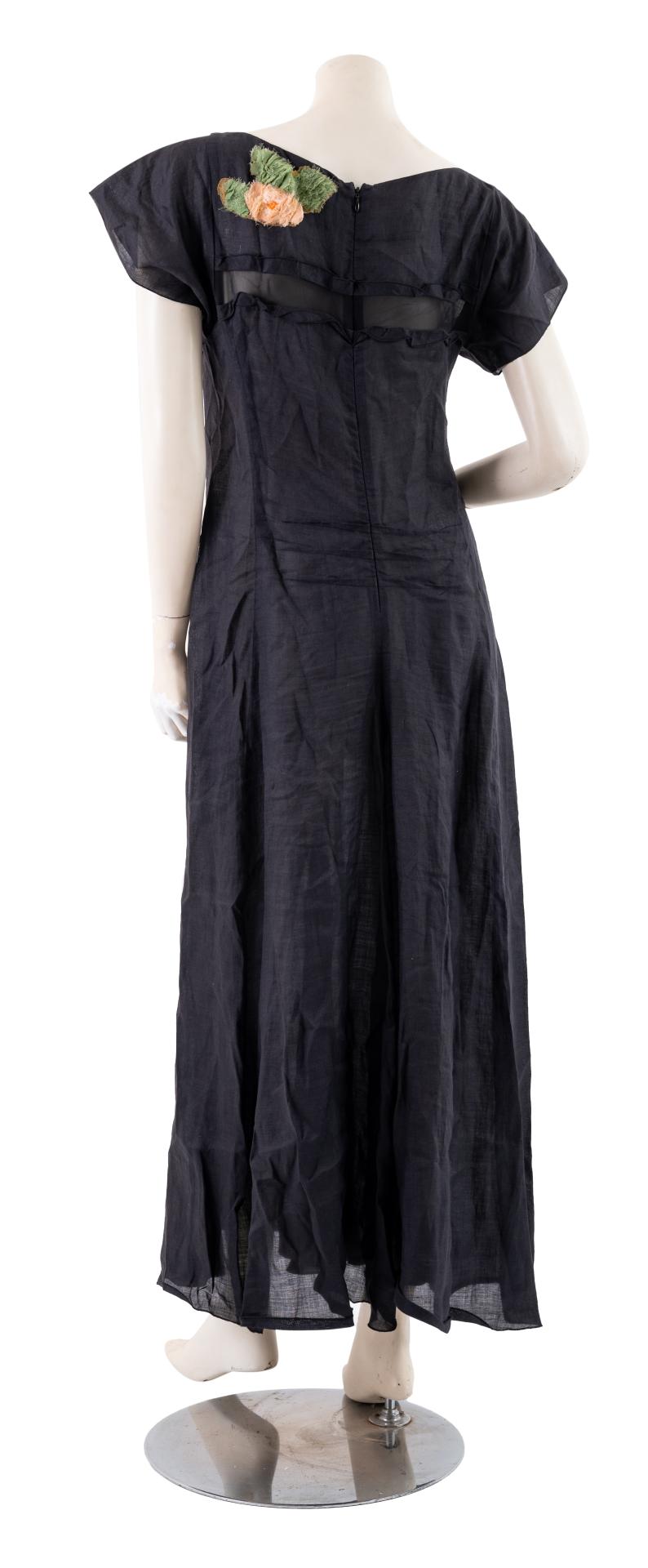 Abito lungo in lino nero con scollatura a barca e manica corta, applicazioni di rose in seta. Etichetta di produzione. Taglia 40.