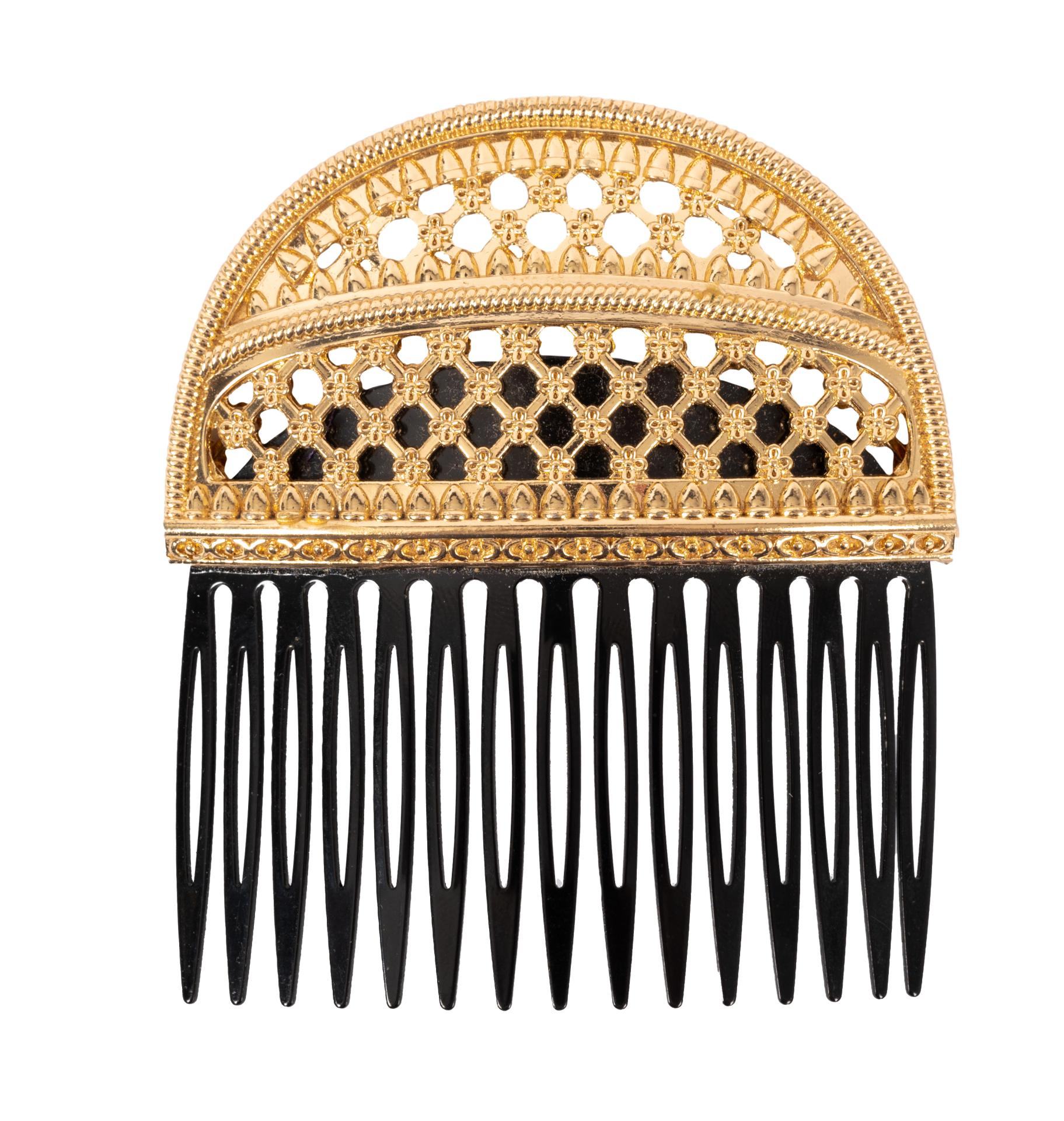 Pettine gioiello in materiale plastico e metallo dorato decorato con piccoli fiori. Marchio di produzione. Misure 7 × 9 cm.