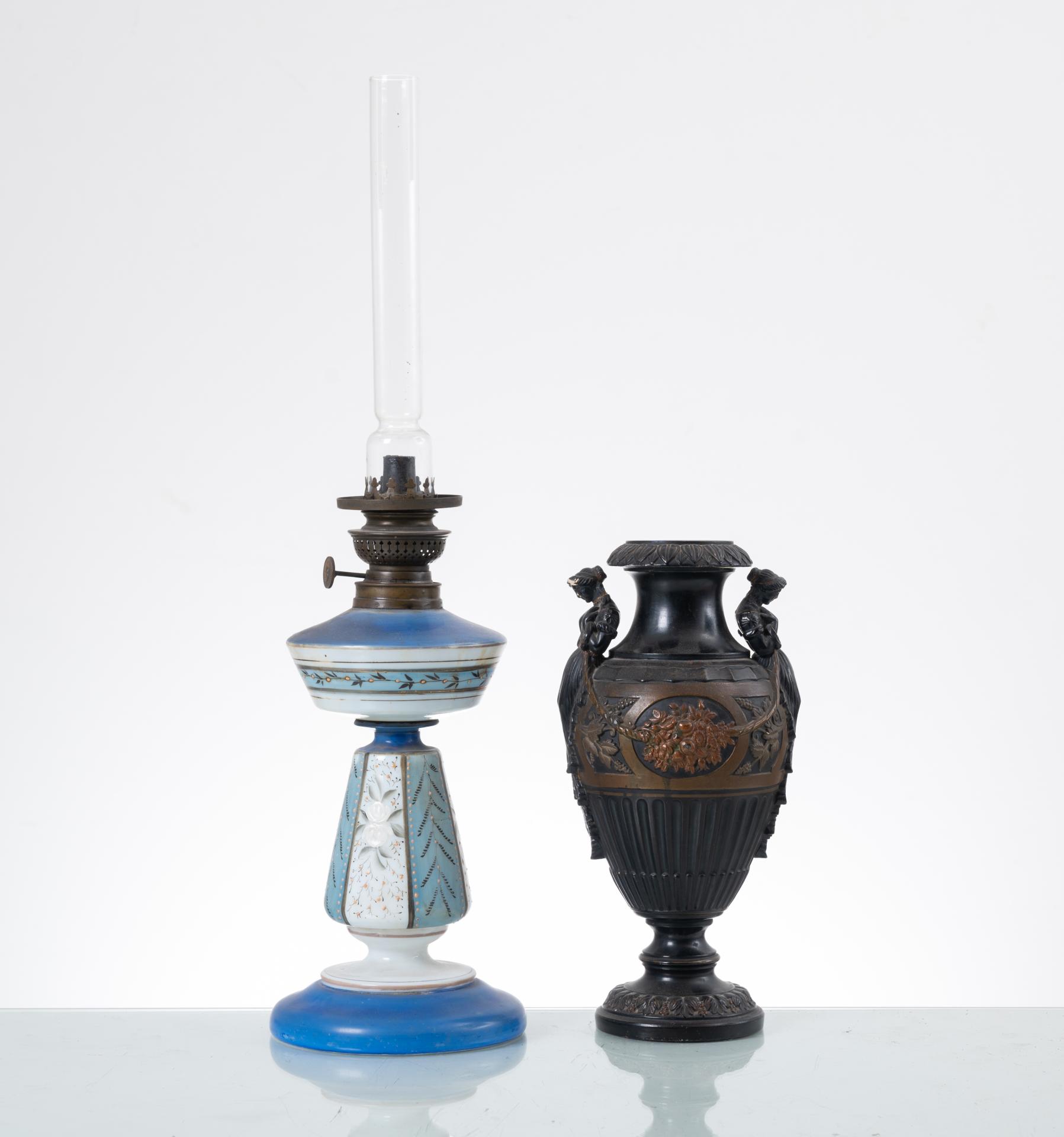 Lume in opaline dipinto a mano nei toni del blu con tubo in vetro e piccolo vaso in ceramica smaltata e decorata a rilievo (usure).