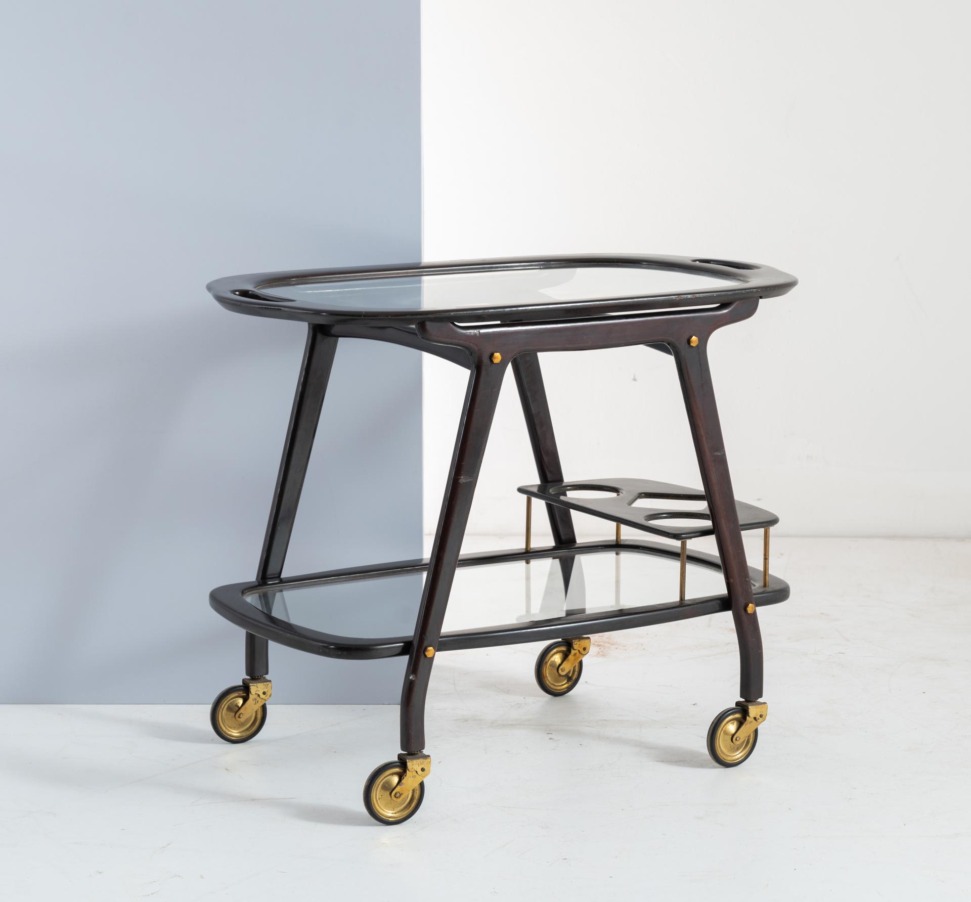 Carrello con struttura in legno ebanizzato e sagomato, piano superiore a vassoio mobile ovale con vetro trasparente, piano inferiore in legno e vetro con piano porta bottiglie. Minuterie e ruote in metallo dorato. Graffi e segni di uso.