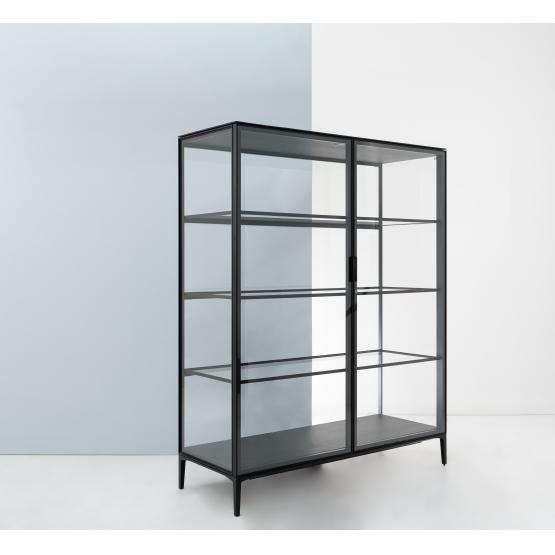Mobile contenitore modello “Alambra” con struttura in alluminio e piano, ante e pannelli laterali in vetro, quattro ripiani interni, due ante con chiusura a battente. Illuminazione a led interna.