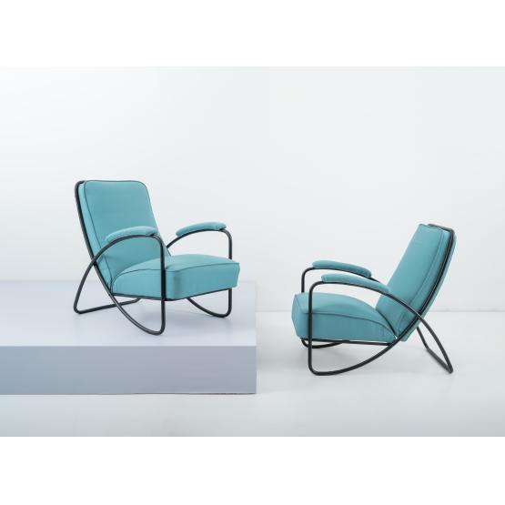 Coppia di poltrone con struttura in tubolare metallico verniciato nero, schienale e seduta con imbottitura e rivestimento in tessuto nei toni del blu. Restaurate.