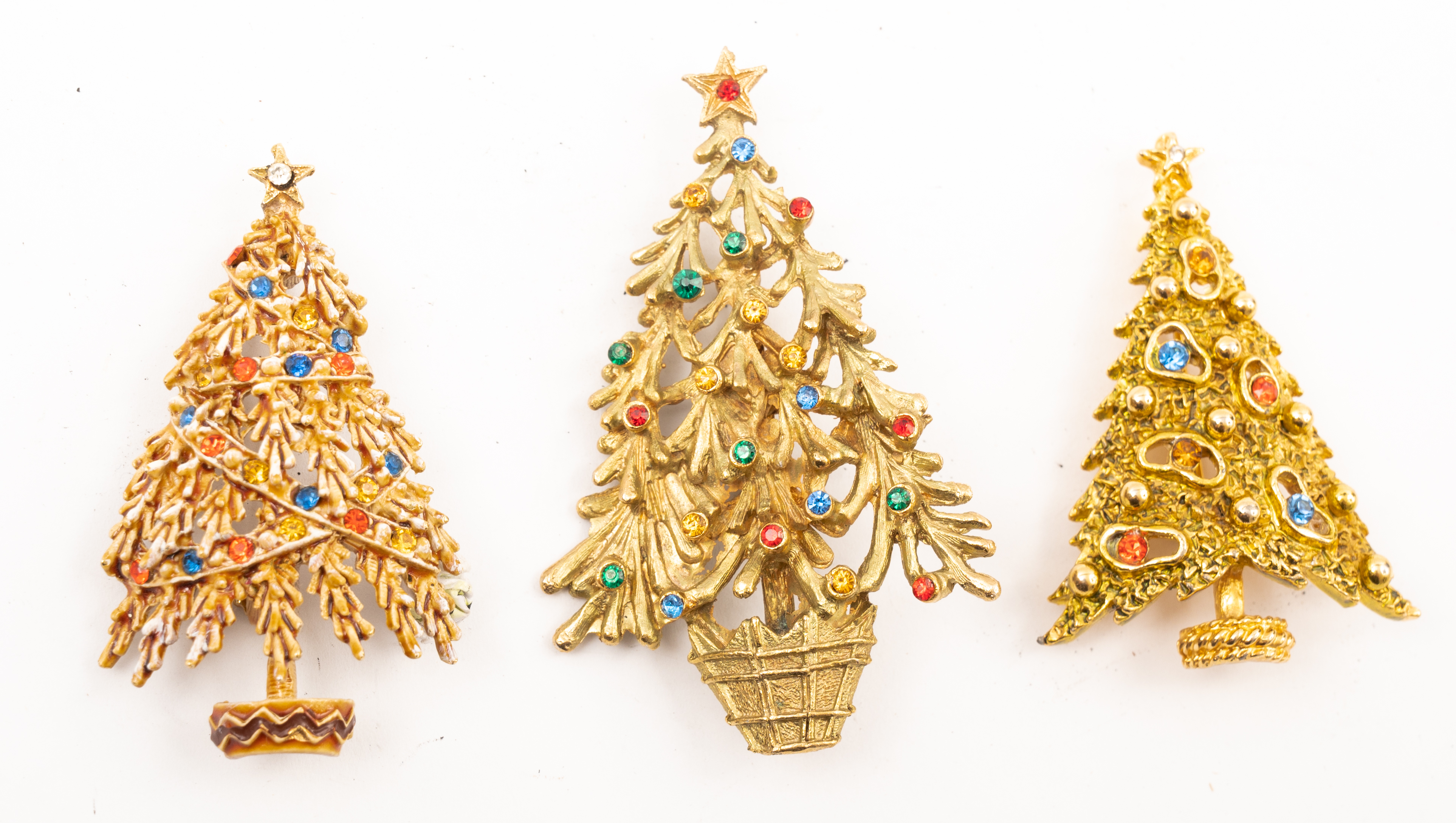 Tre spille albero di Natale: ART spilla in metallo dorato con piccoli strass colorati; Produzione Americana spilla in metallo dorato con strass di colore differente; ART spilla in metallo dorato con strass di colore differente e sfere in metallo dorato lucido. Marchi di produzione.