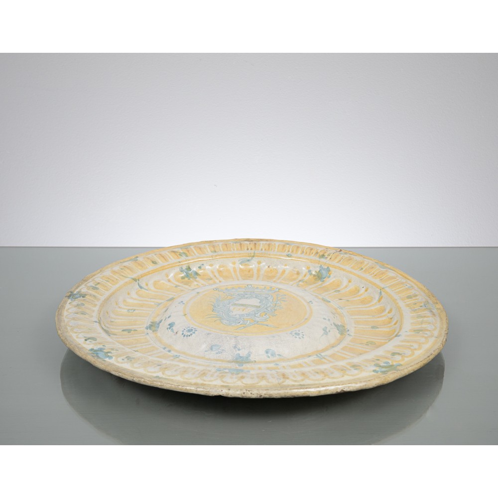 Grande piatto a lustro in maiolica baccellata e smaltata recante blasone con ascrizione "Assisum 1515".