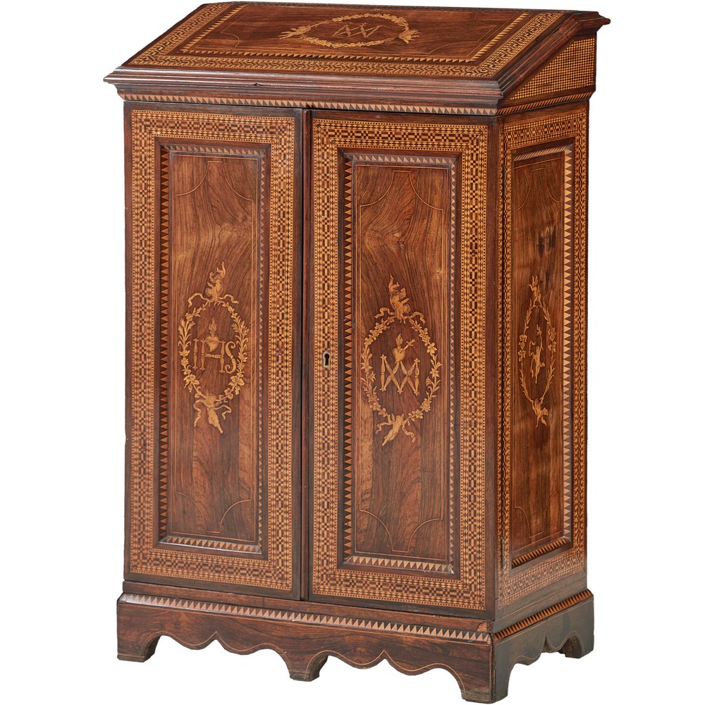 Importante inginocchiatoio Carlo X a due ante in legno di palissandro, finemente intarsiato in bosso a motivo di ghirlande e cherubini.