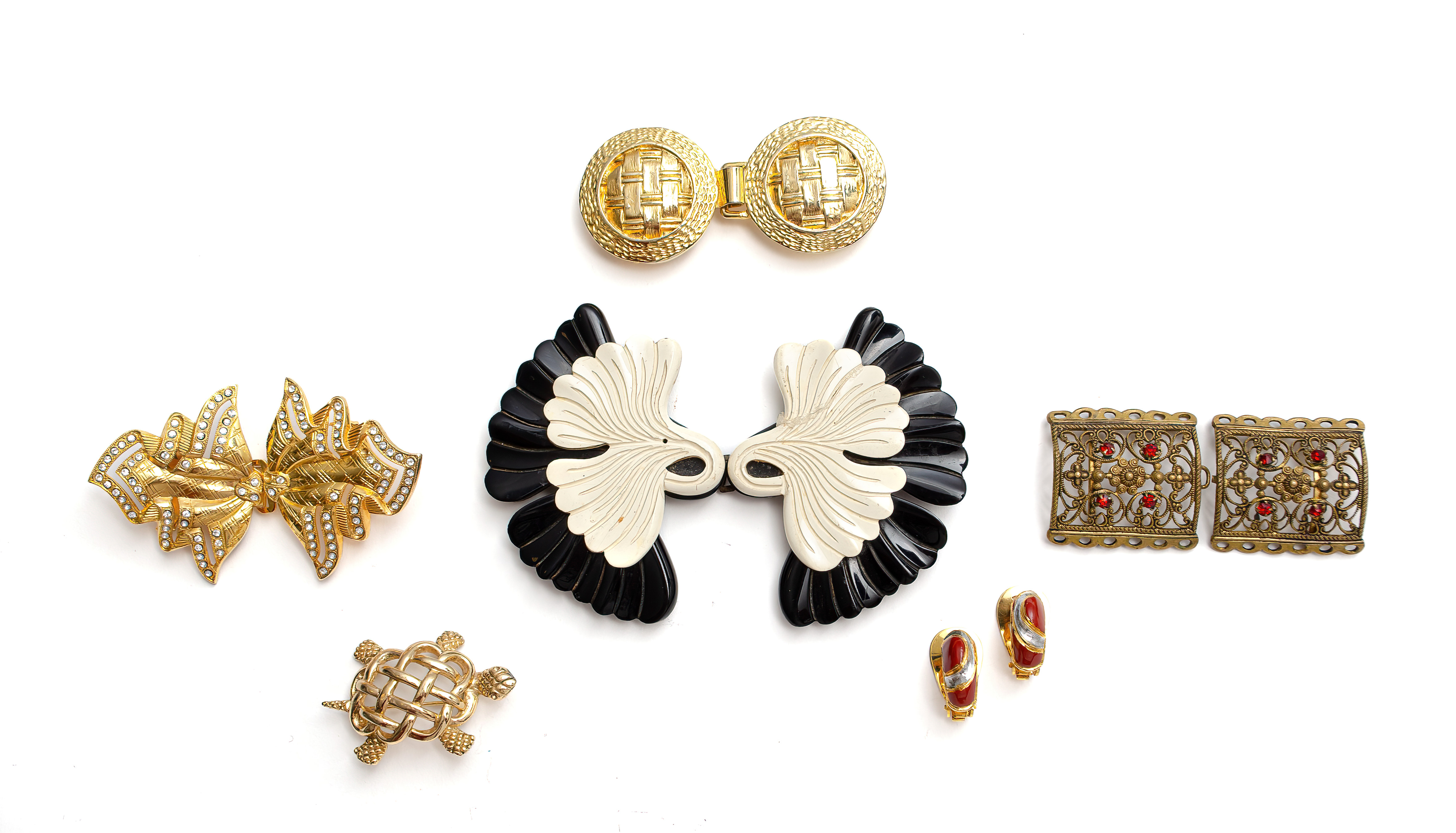 Spilla tartaruga con montatura in metallo dorato, guscio reticolato. Marchio di produzione. Orecchini a semicerchio con montatura in metallo dorato, decorati con smalti bordeaux e argentatura, chiusura a clips. Marchio di produzione. Fibbia in bachelite nera a motivo floreale; fibbia in metallo dorato con lavorazione a filigrana e decorata a motivo floreale e gemme sintetiche color rubino; fibbia con montatura in metallo dorato a motivo plissettato, bordata di diamanti sintetici taglio brillante; fibbia con montatura in metallo dorato e due pastiglie circolari con lavorazione a tessuto, chiusura a gancio.