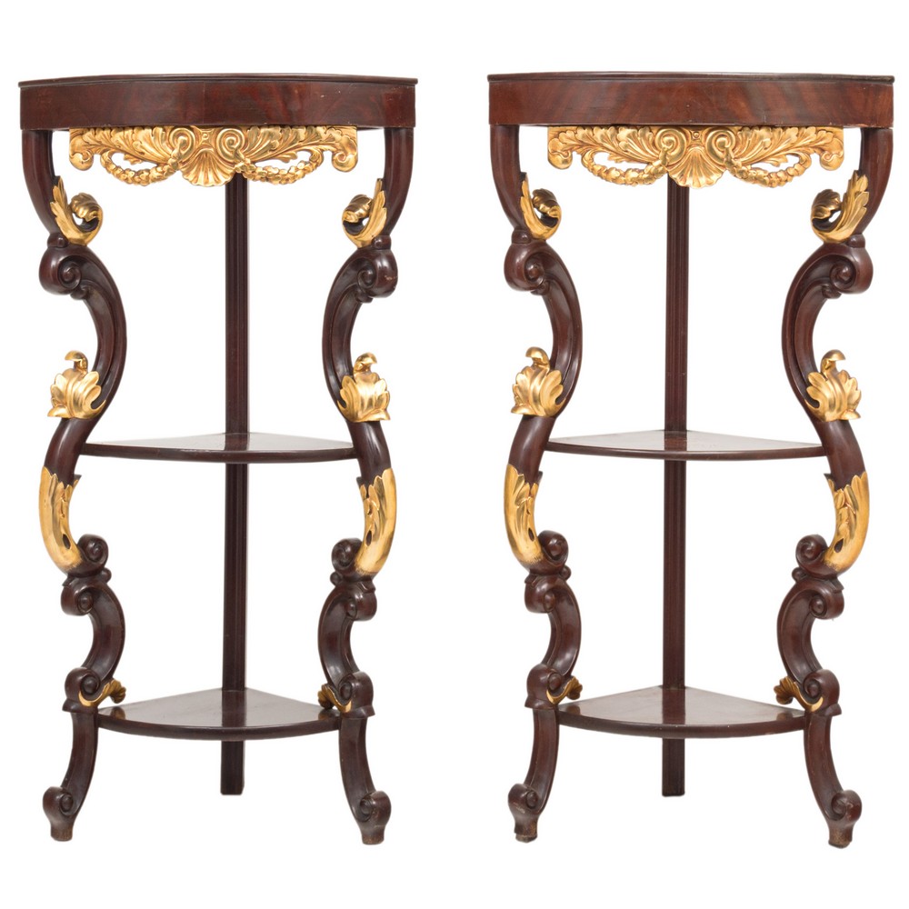 Coppia di cantoni angolari a tre ripiani, in legno di noce e fregi dorati con blasone nobiliare.