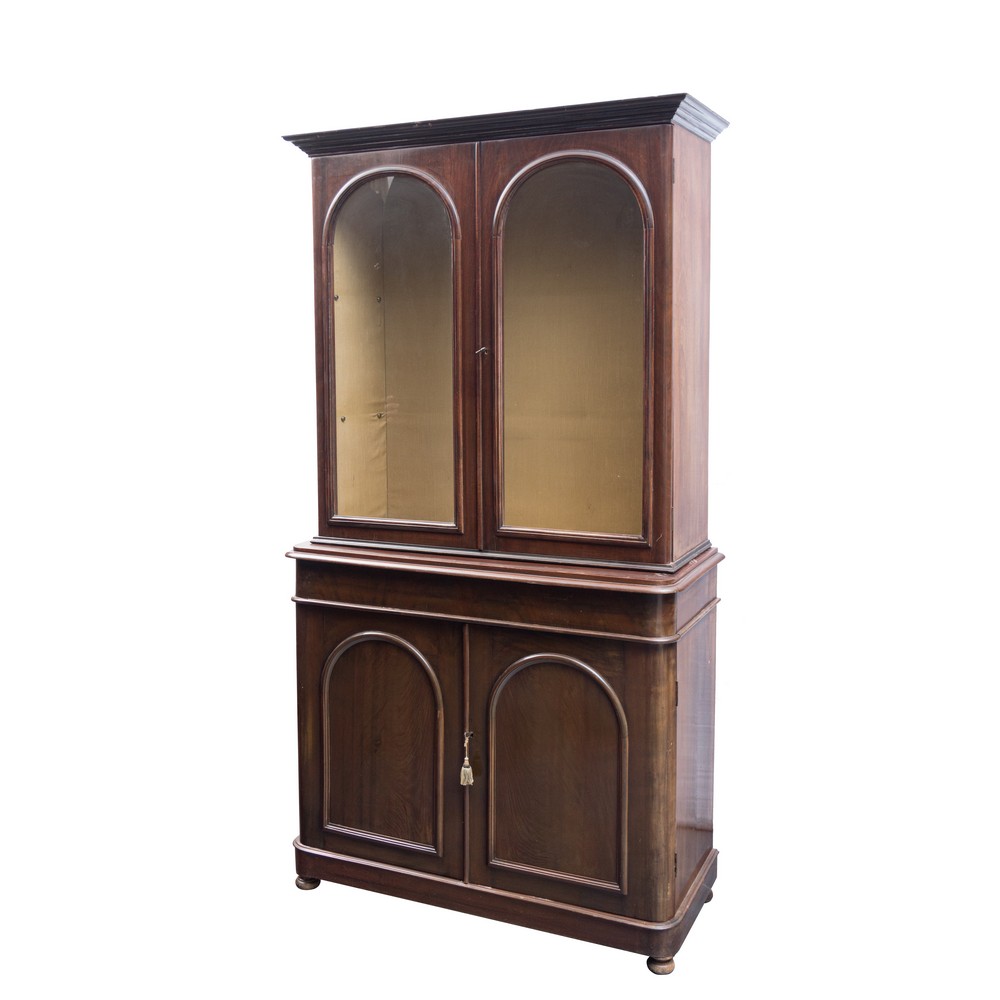BOOKCASE in mogano a due ante a vetri nella parte superiore e due ante in quella inferiore.