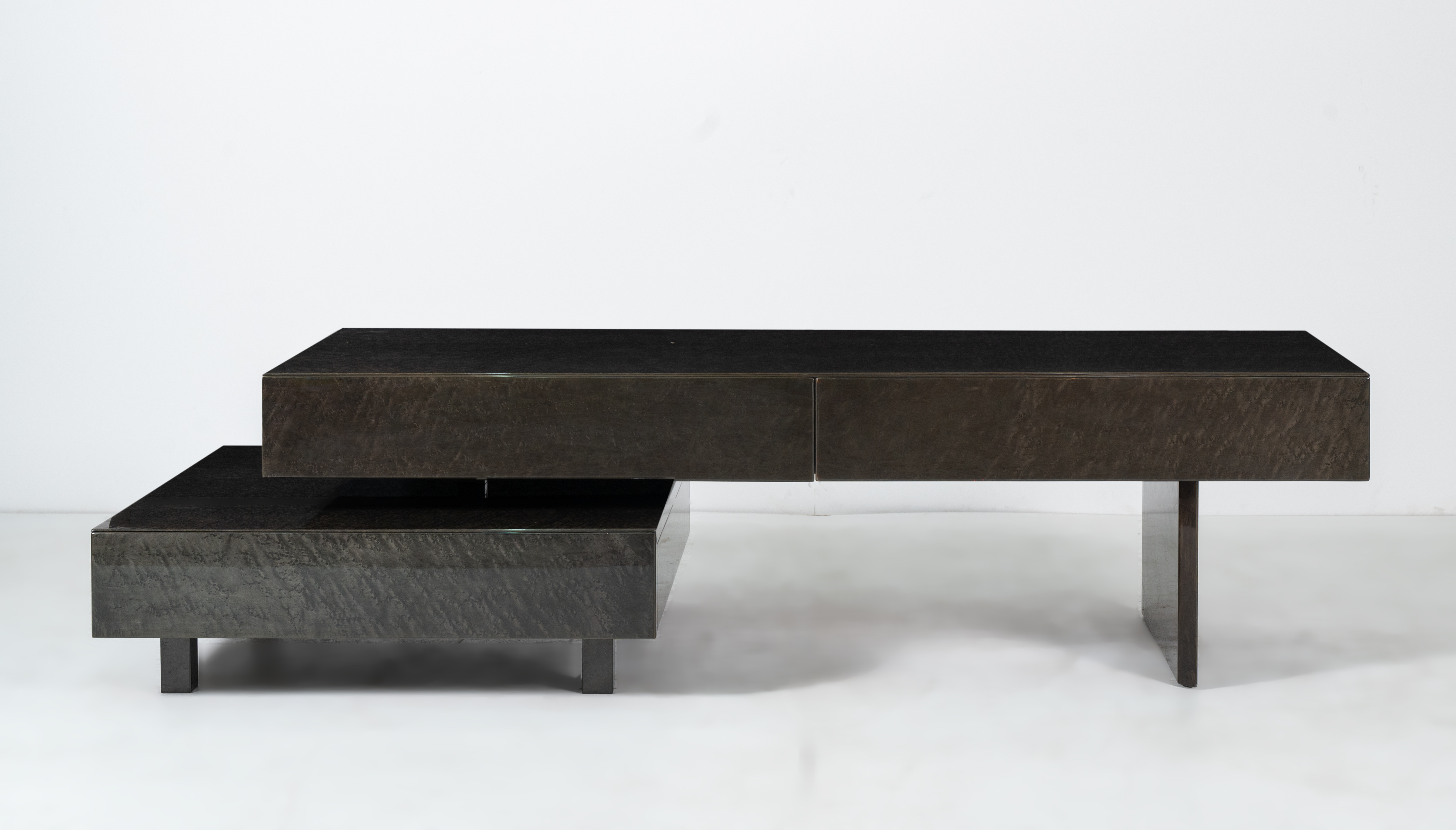 Composizione bassa in radica di acero tinto verde, composta da due elementi amovibili, quello più alto con due cassetti sul fronte, l'altro con un cassetto.