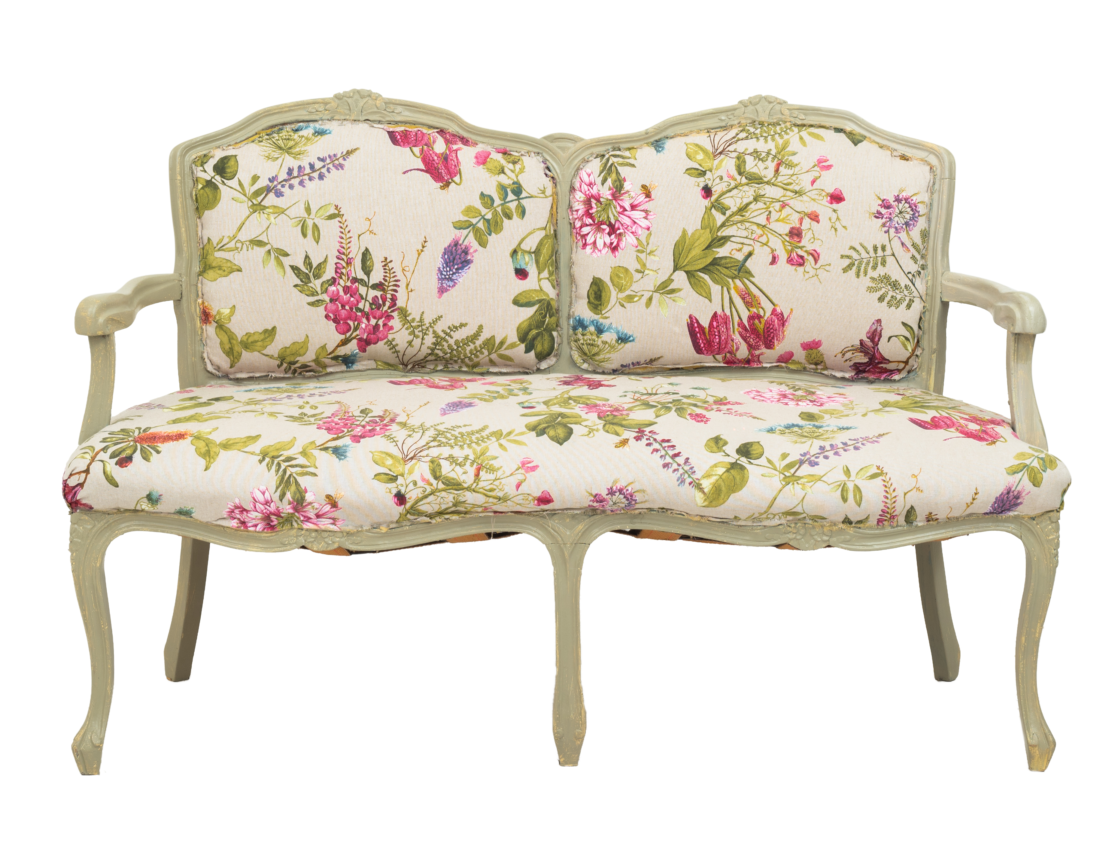 Divano a due posti in legno laccato con tessuto a motivo floreale.