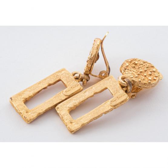 Parure Cardin anni ‘70,composta da collana e orecchini in metallo dorato a figure geometriche. Lunghezza orecchini cm 5.