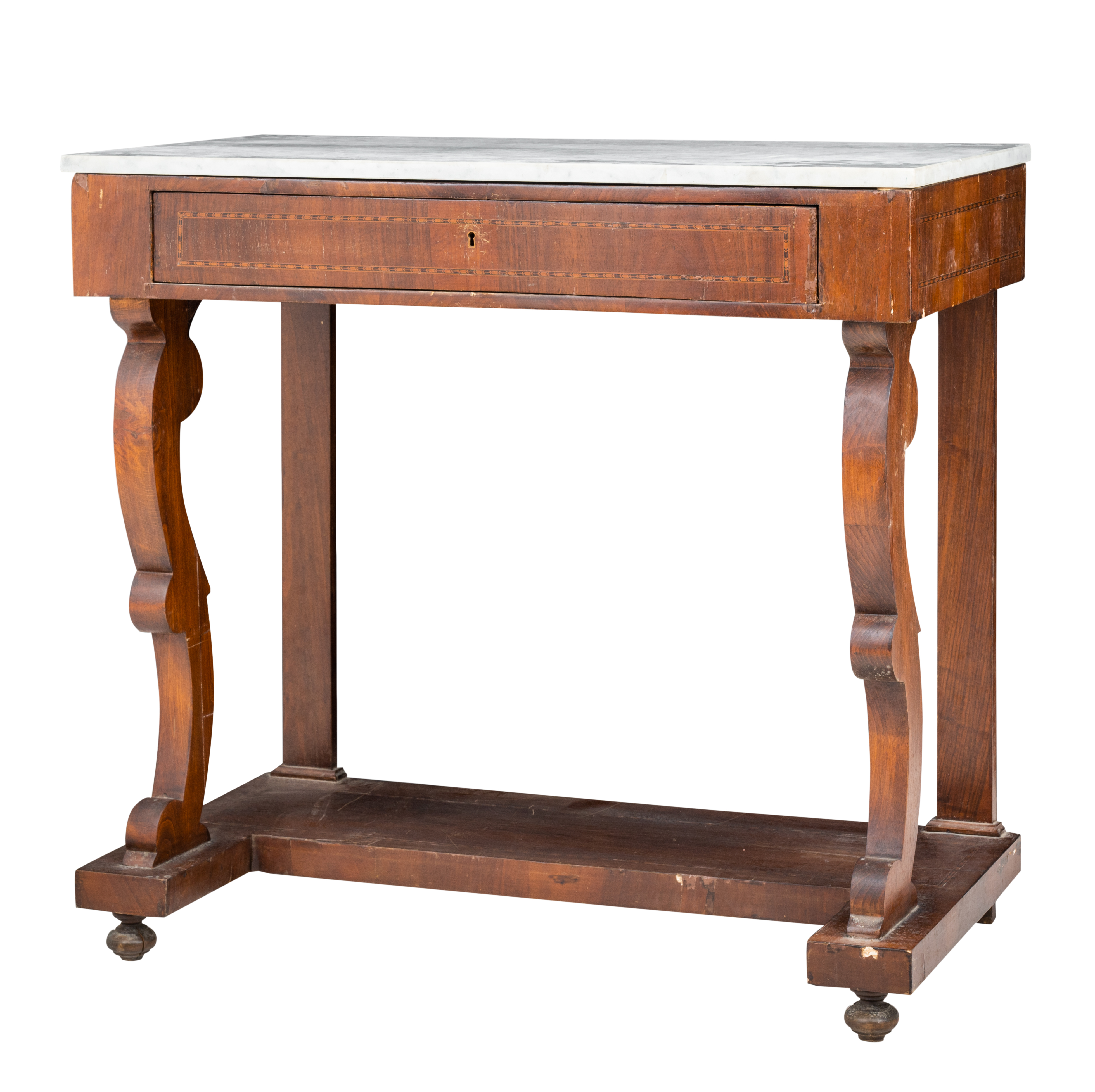 Consolle con cassetto centrale in legno di noce con marchetterie, piano in marmo bianco di Carrara.
