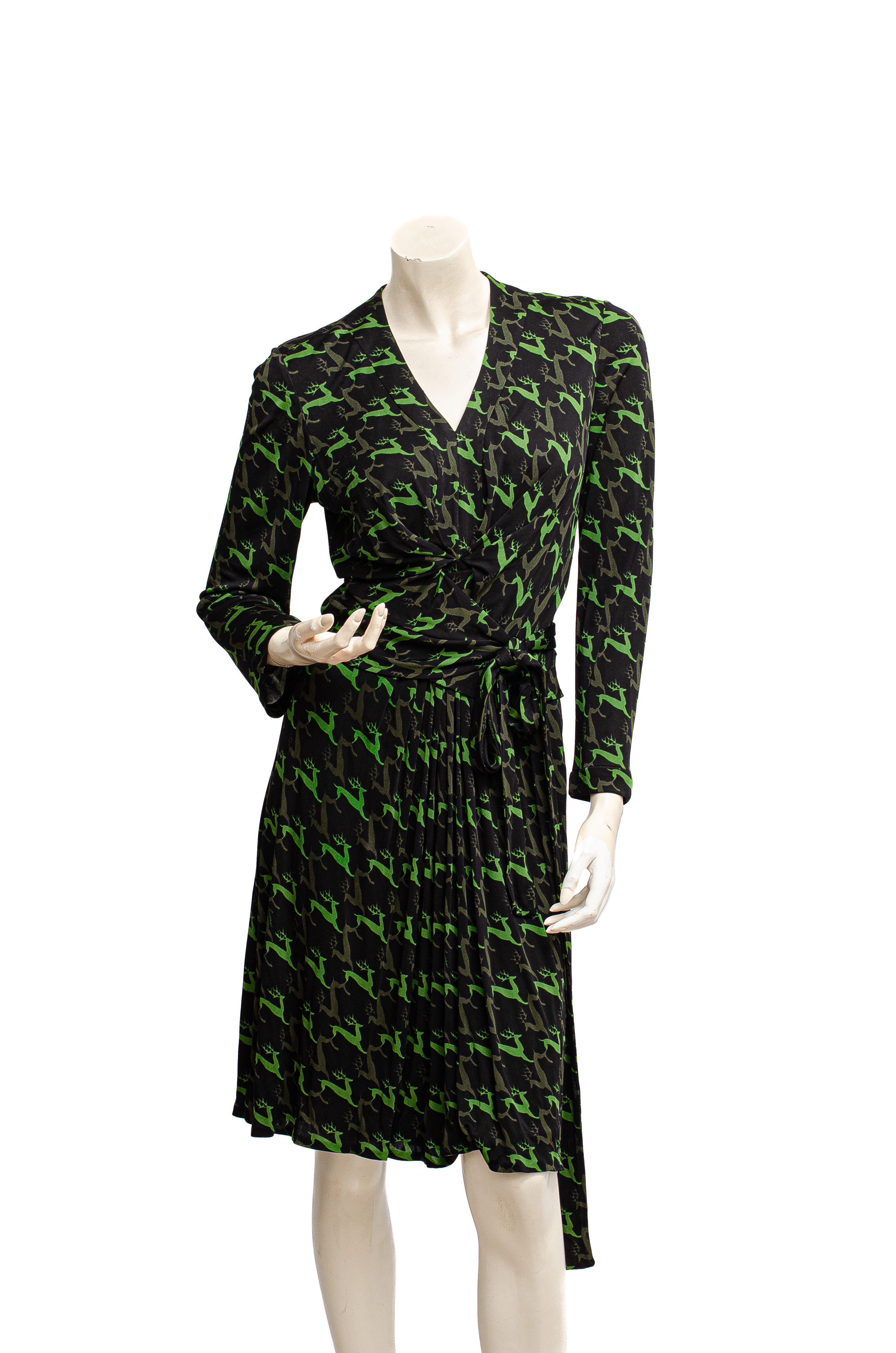 Abito lungo in viscosa nera con stampa a motivo di cervi nei toni del verde, maniche lunghe, collo a V, incrocio sul davanti, cintura. Etichetta di produzione. Taglia S.