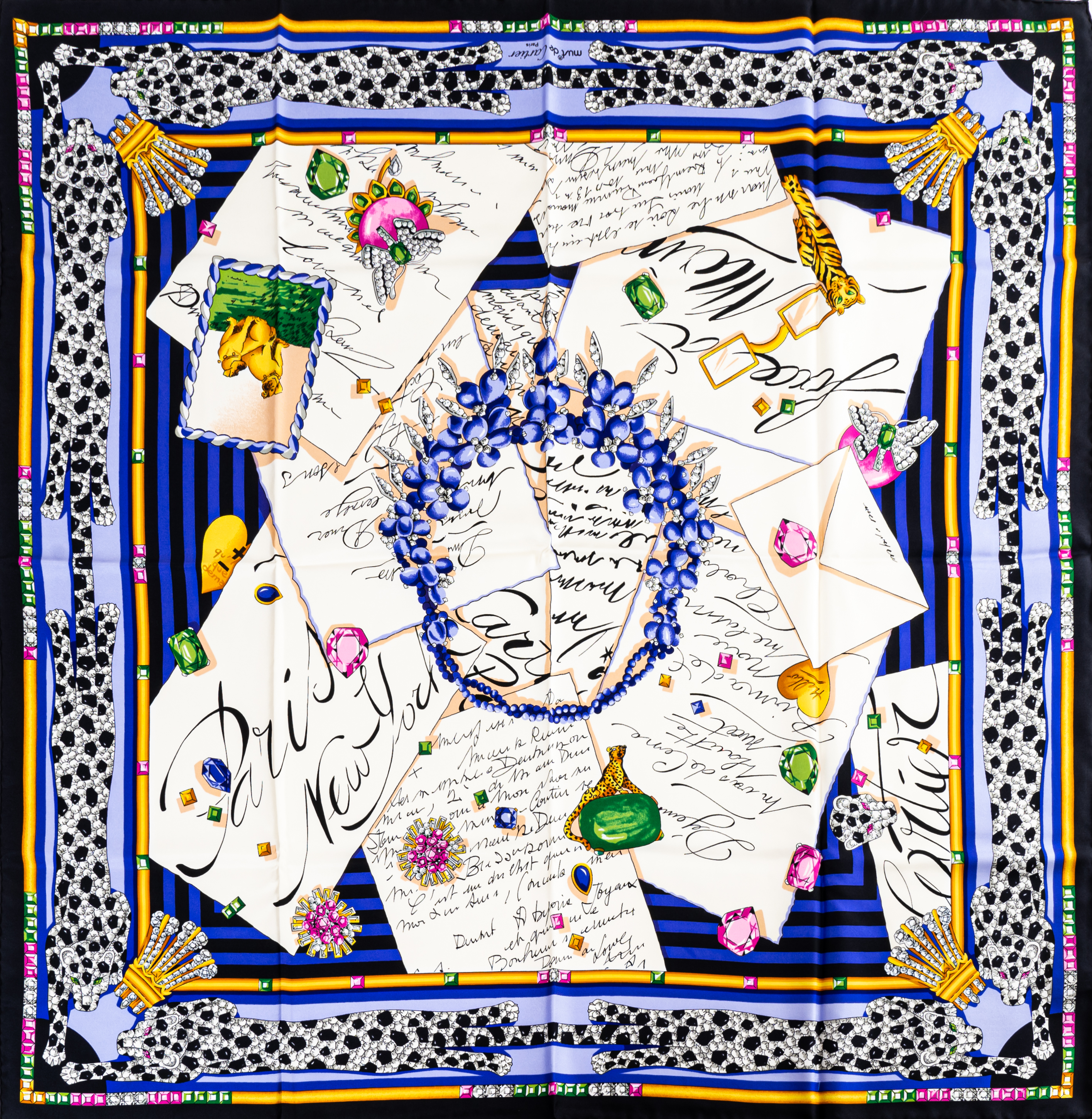 Foulard in seta "Lettere d’Amore", disegni di gioielli policromi e scritte su fondo bianco, cornice nera, mai indossato. Marchio di produzione e certificato di garanzia.