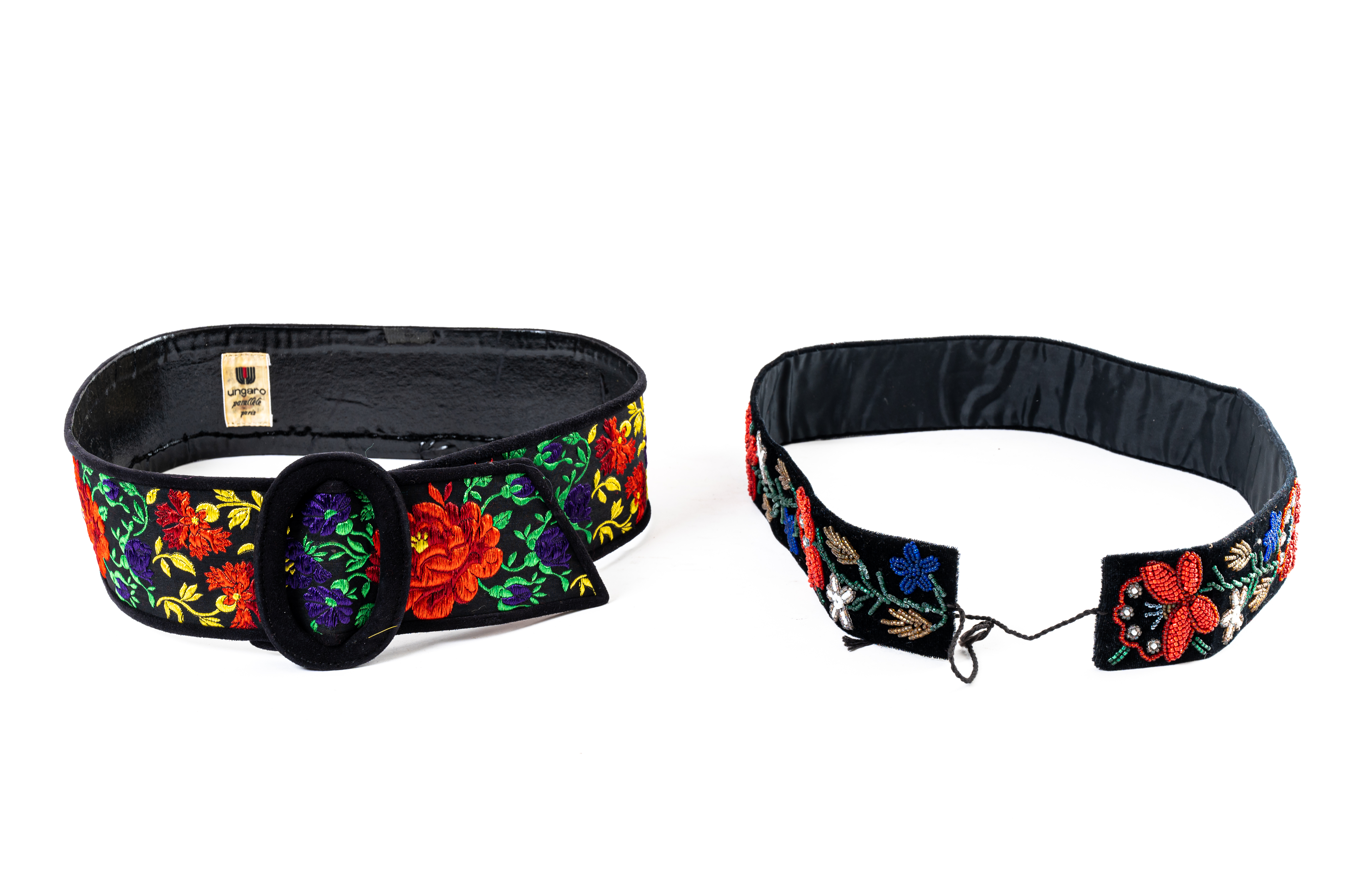 Cintura rivestita in tessuto nero ricamata in policromia con motivi floreali, fibbia ovale. Etichetta di produzione. Cintura rivestita in velluto nero ricamata con perline in policromia a motivi floreali, chiusura con nastro.