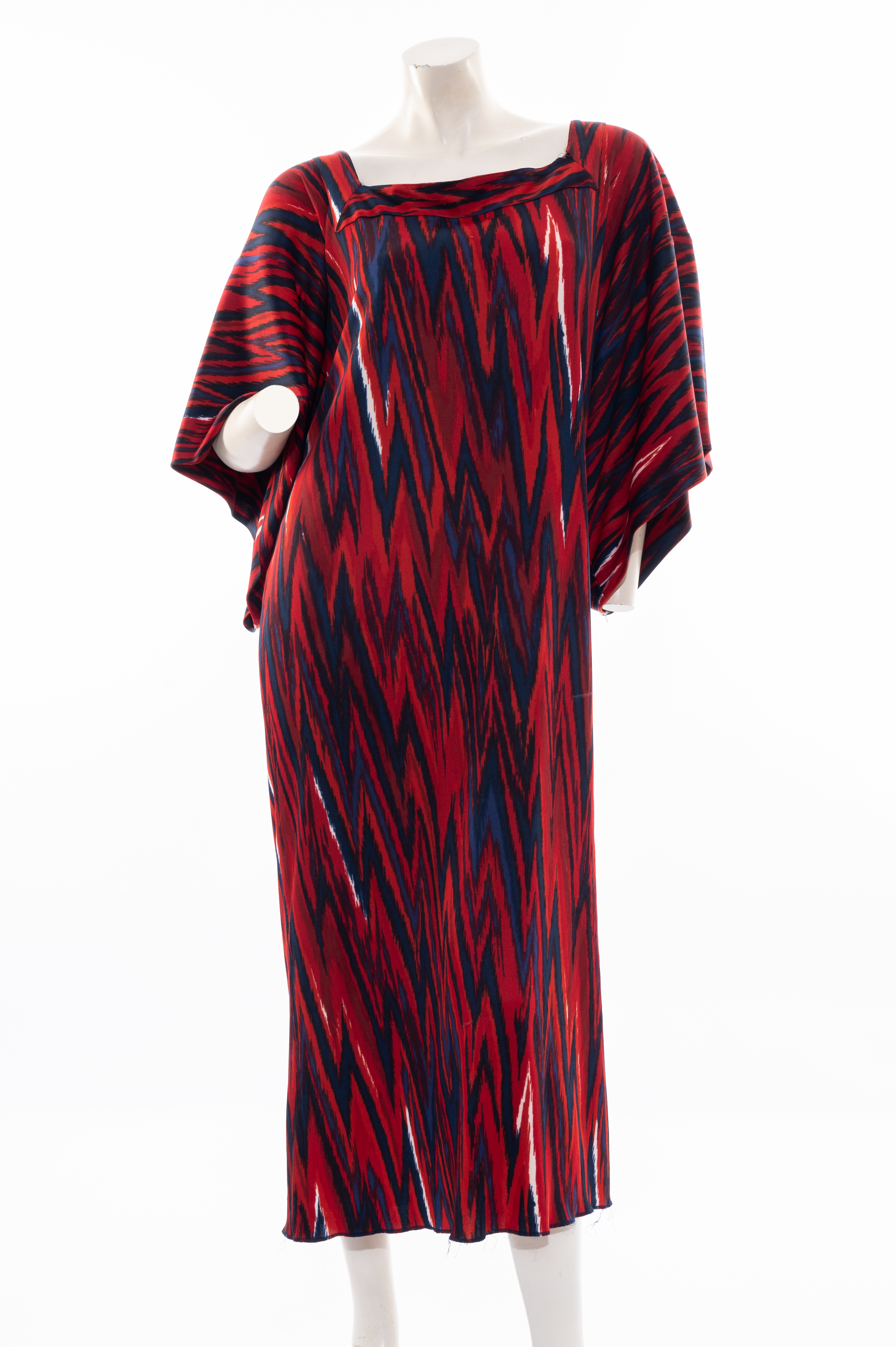 Abito in jersey di cotone a disegno a fiamma nei toni blu, rosso e bianco, collo squadrato, manica asimmetrica. Lieve scucitura sul collo. Taglia L. Etichetta di produzione.