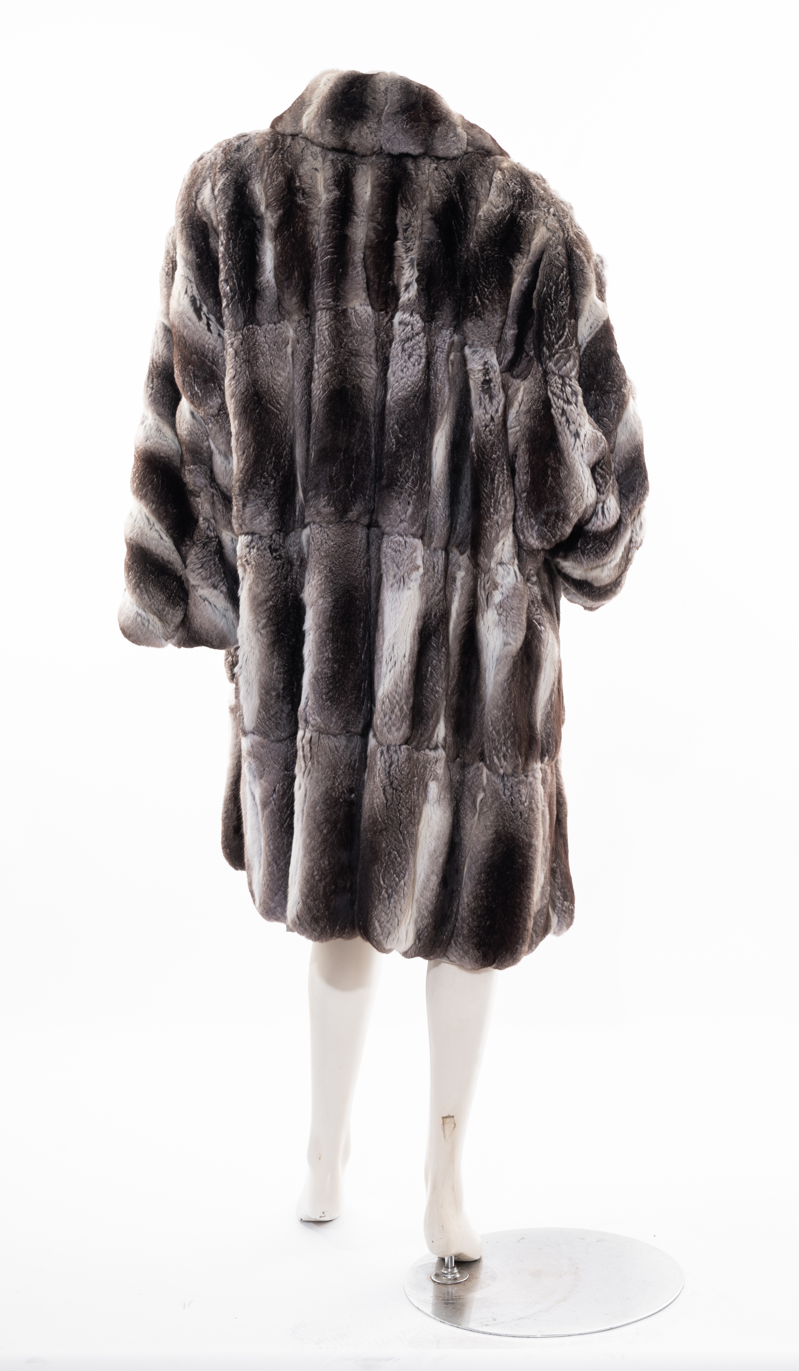 Cappotto in pelliccia di animale di allevamento, lavorazione a pelli intere verticali, ampio collo sciallato a pelli orizzontali e rivoltato fino all’orlo, ampia manica con lavorazione diagonale. Tagli L.