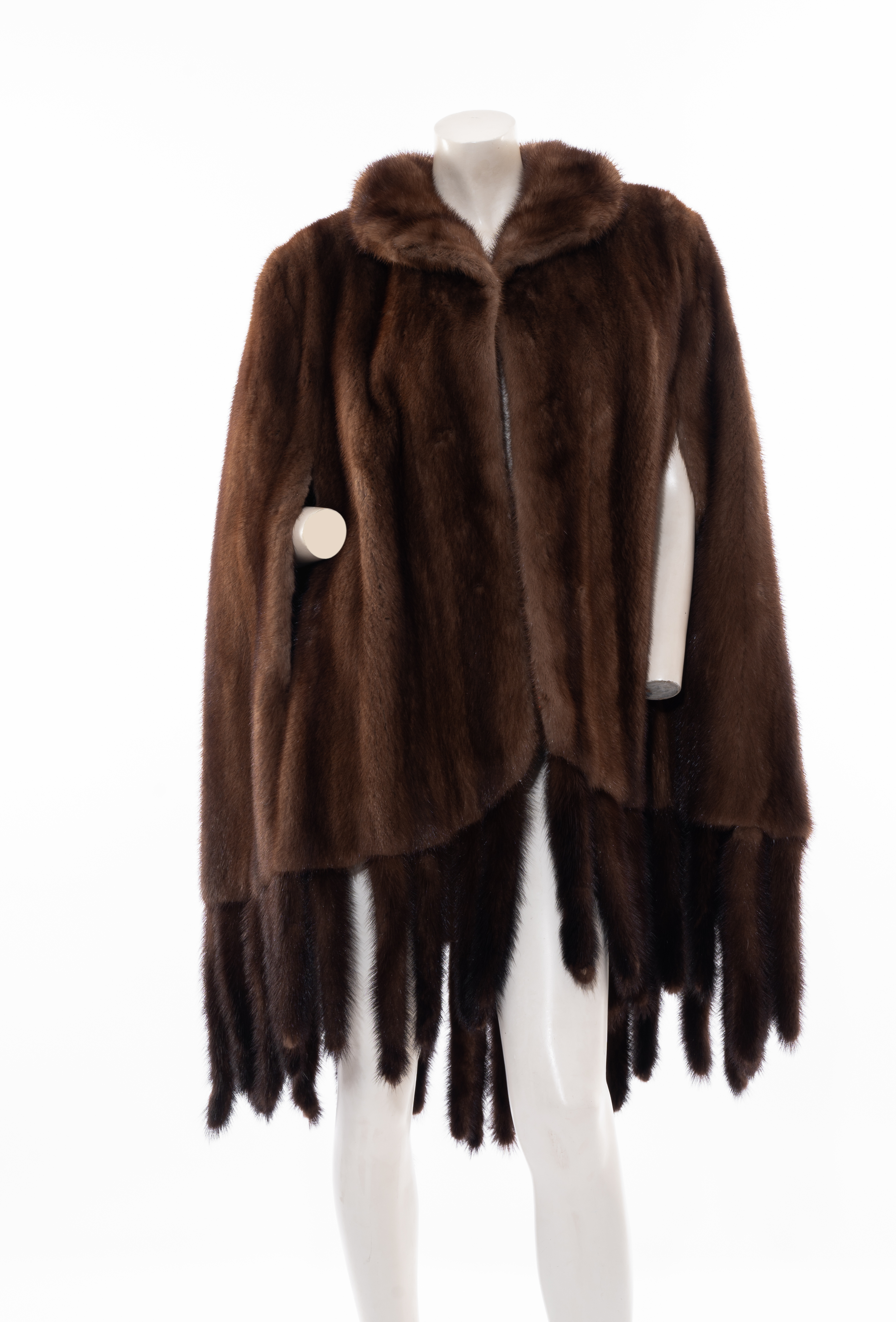 Mantella in pelliccia di visone Saga Royal, colletto arrotondato, apertura frontale con chiusura a ganci, due aperture per le braccia, bordata di codine. Taglia unica. Etichetta di produzione.