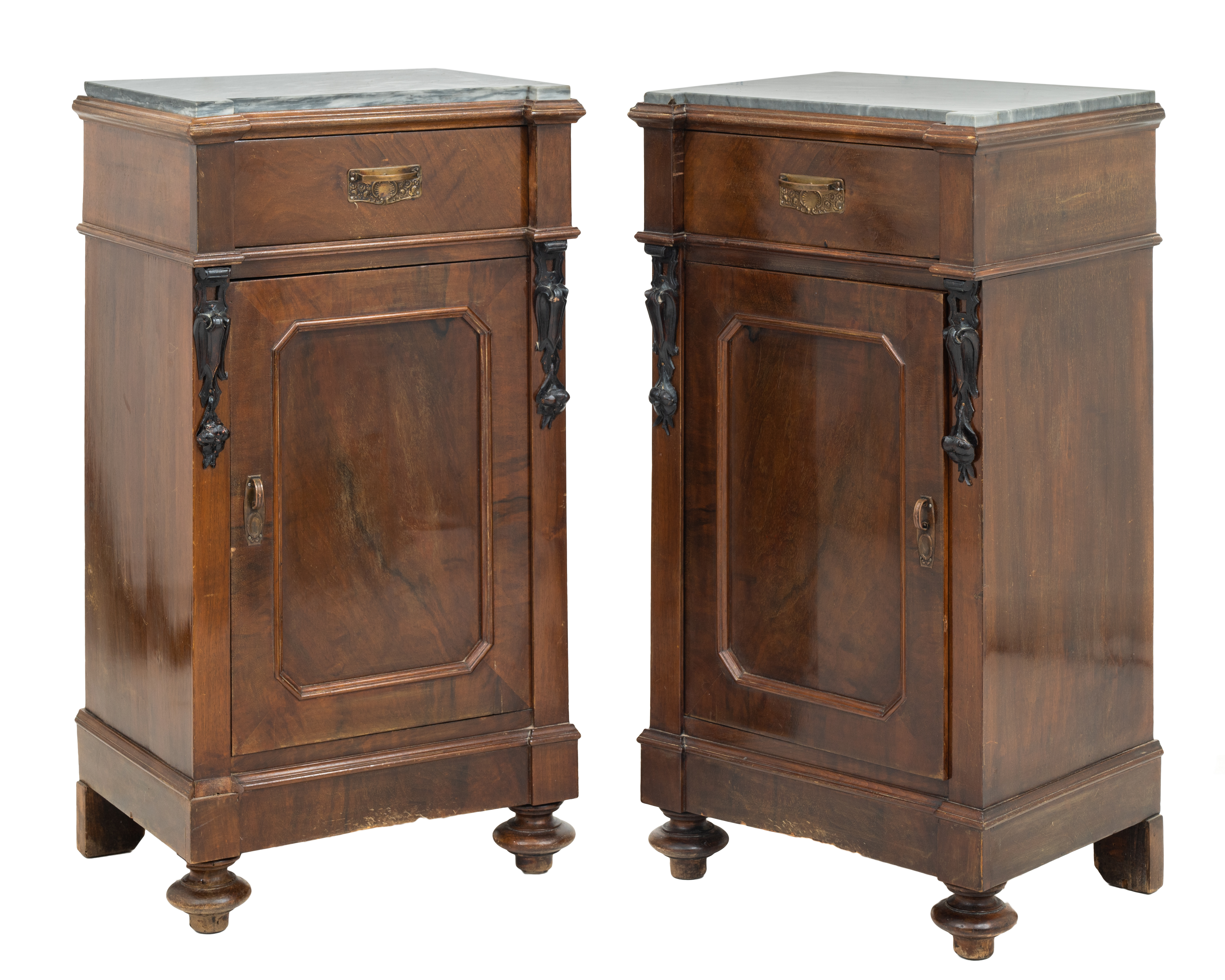 Coppia di comodini ad un'anta e cassetto in legno di noce, piani in marmo grigio venato.