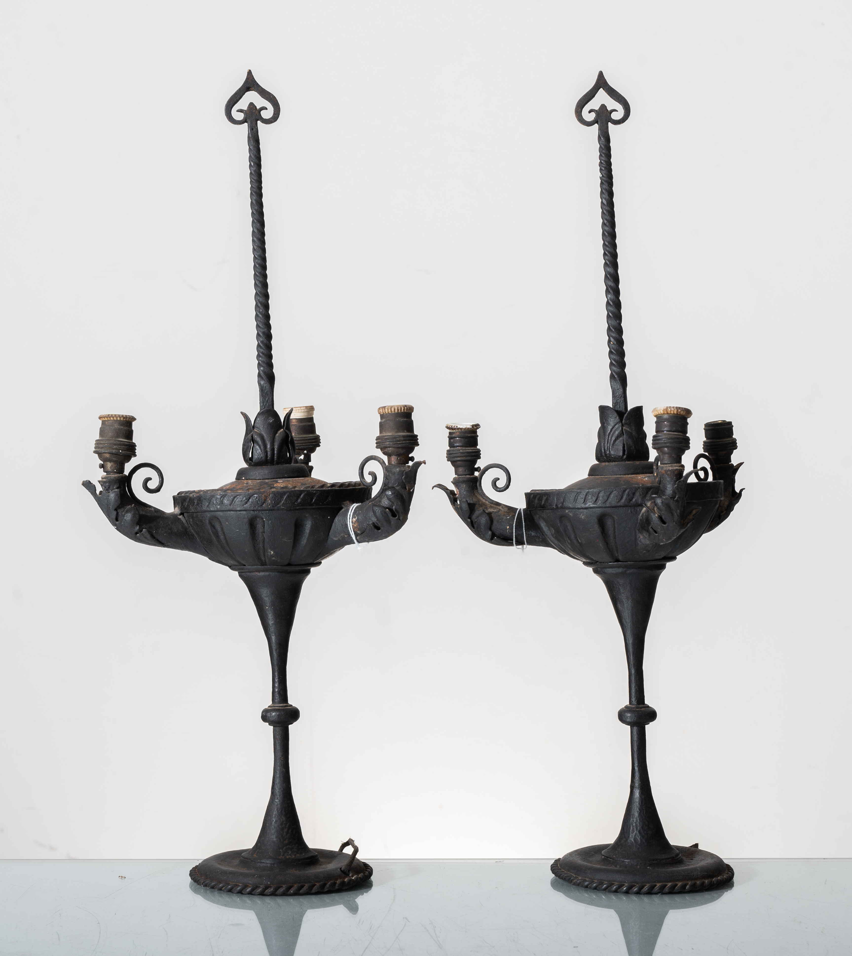 Due lumiere a tre fiamme in ferro brunito (elettrificati) (usure).