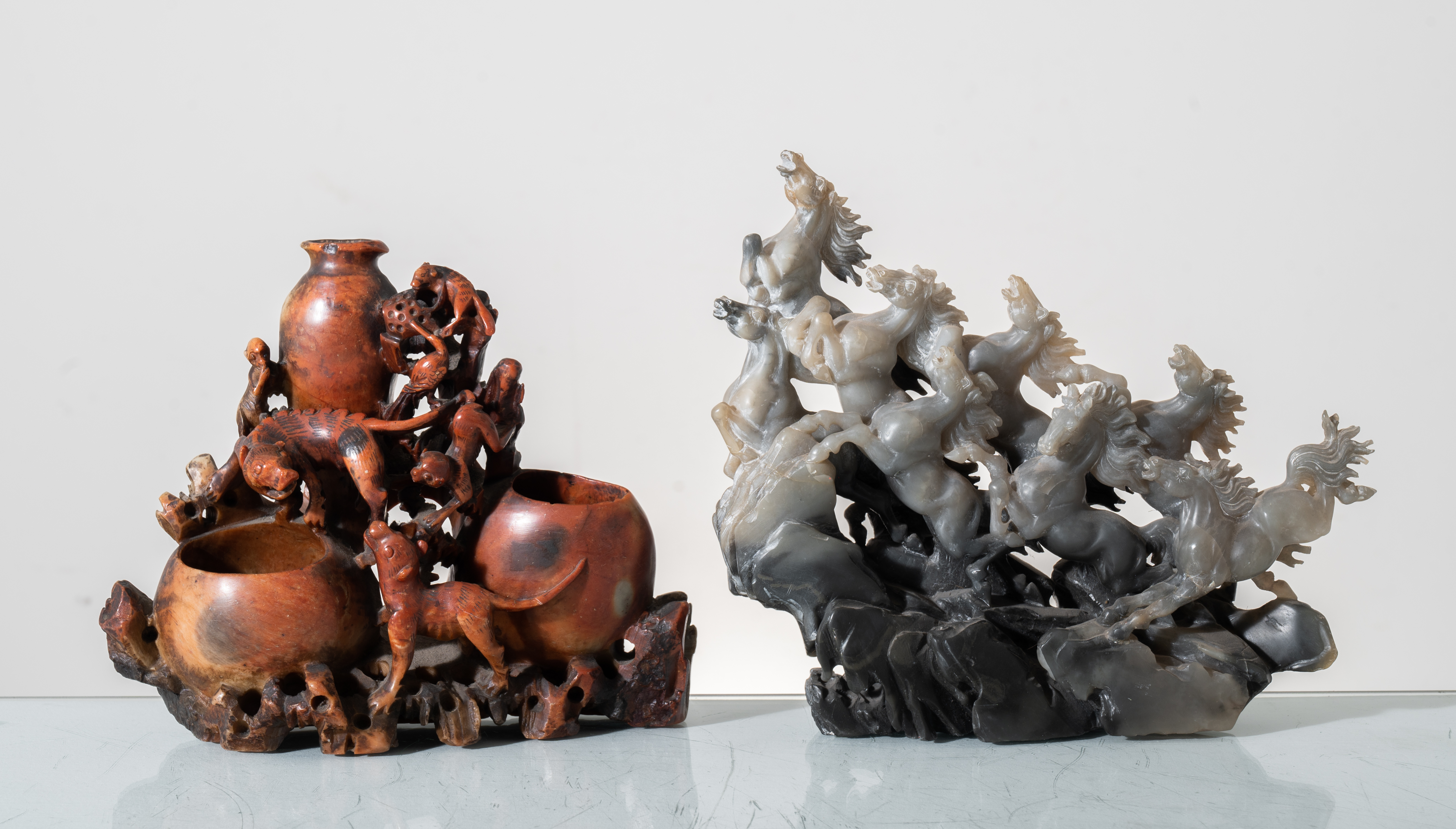 Due sculture in pietra saponaria raffiguranti "Gruppo di cavalli" e " Scimmie con cani".