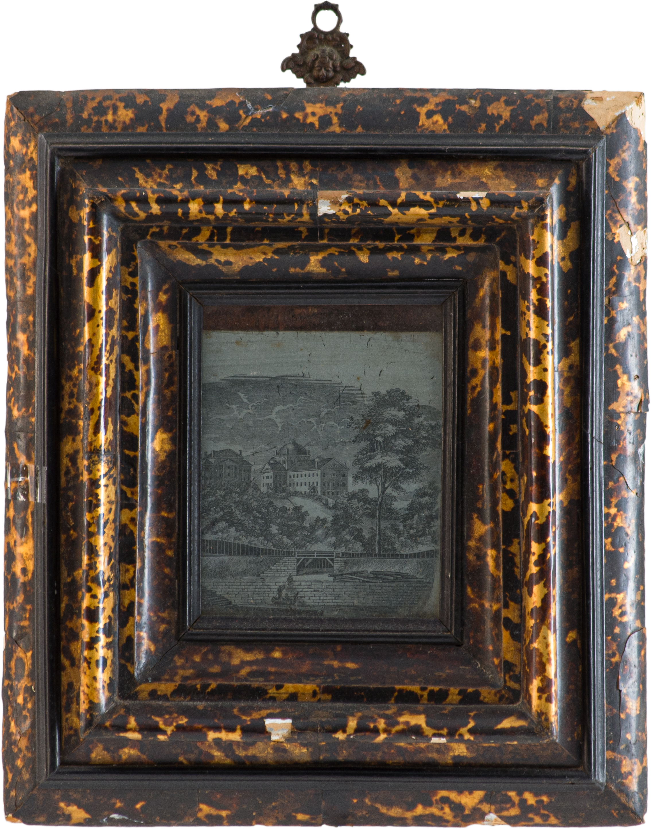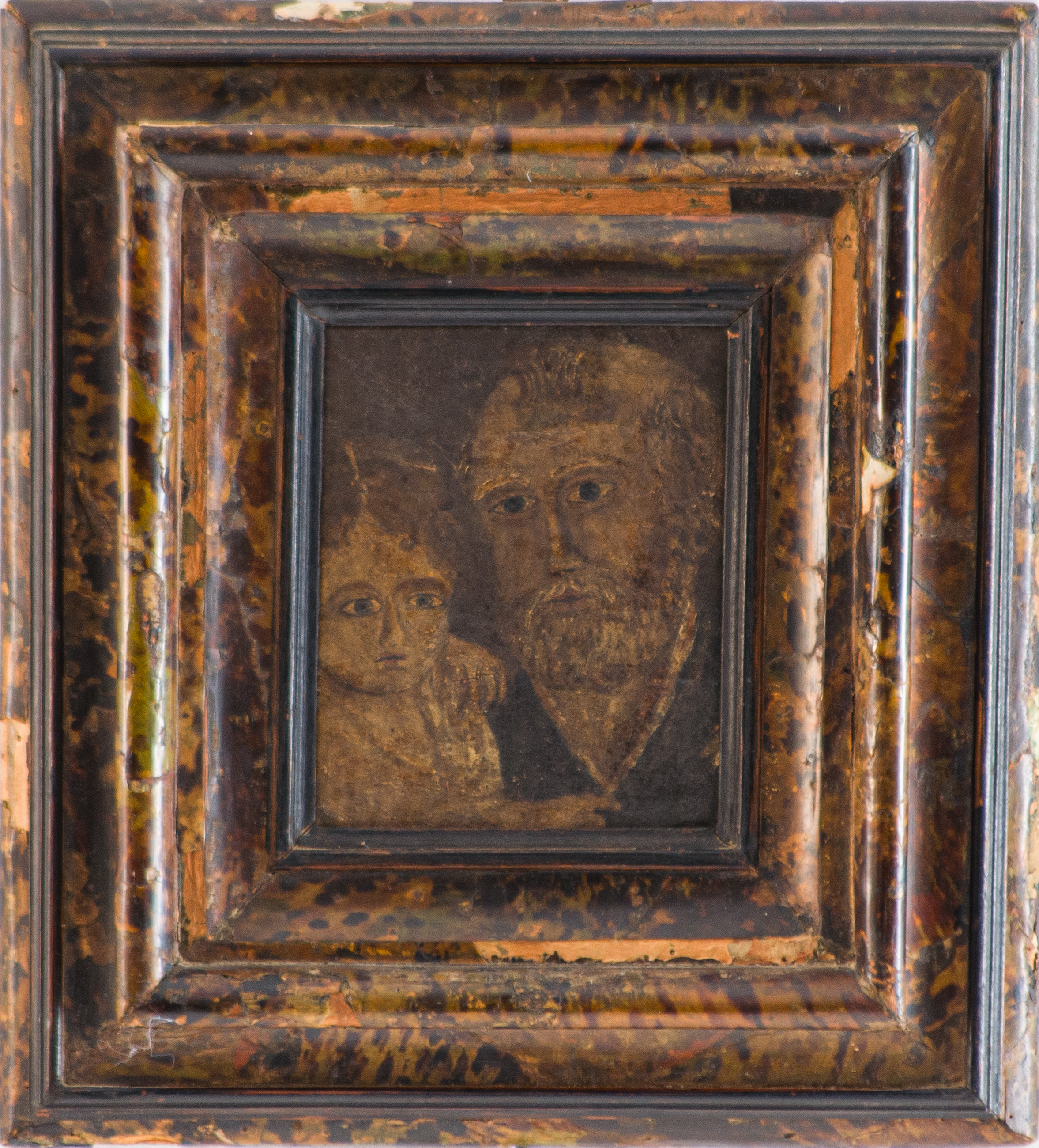 Due cornici rivestite in tartaruga con all'interno una olio su tela raffigurante "San Giuseppe con Bambino" ed una con stampa applicata su vetro raffigurante "Paesaggio". Le opere sono corredate da certificato Cites.
