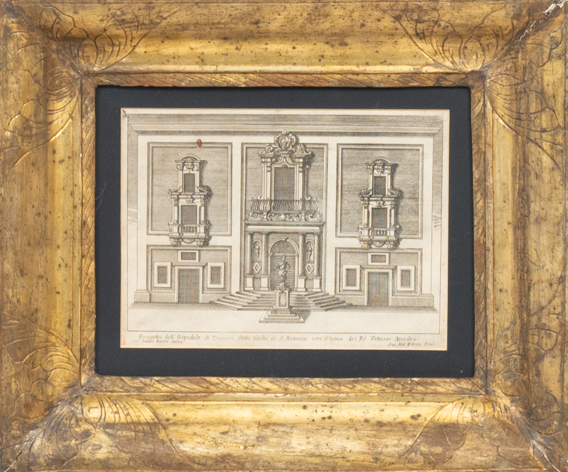 Cornice a guantiera in legno dorato ad argento a mecca con all'interno incisione raffigurante "Progetto dell'Ospedale di Trapani" incisore Antonio Bova.