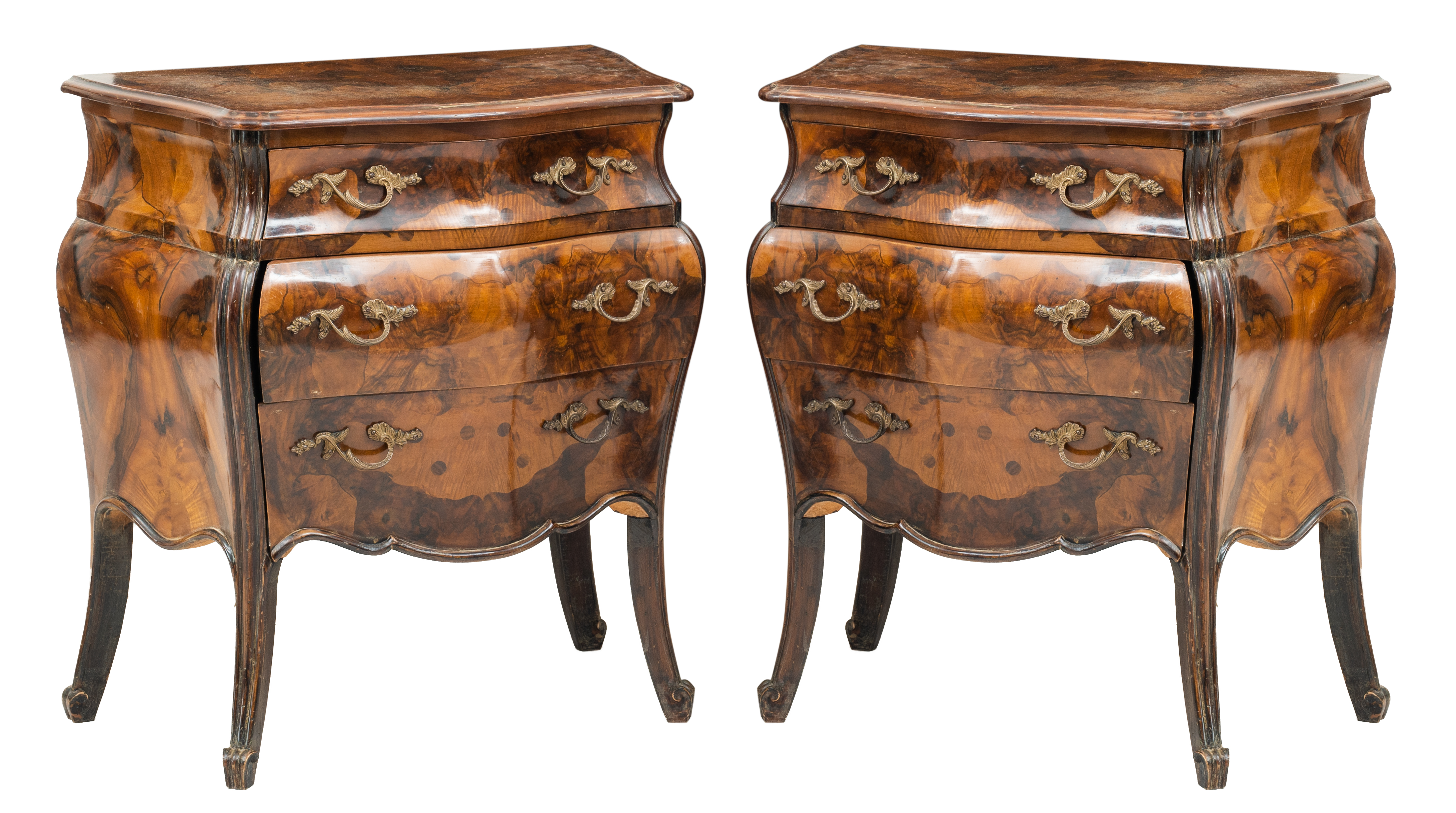 Coppia di comodini di gusto barocco a tre cassetti in radica di noce e radica di tuja.