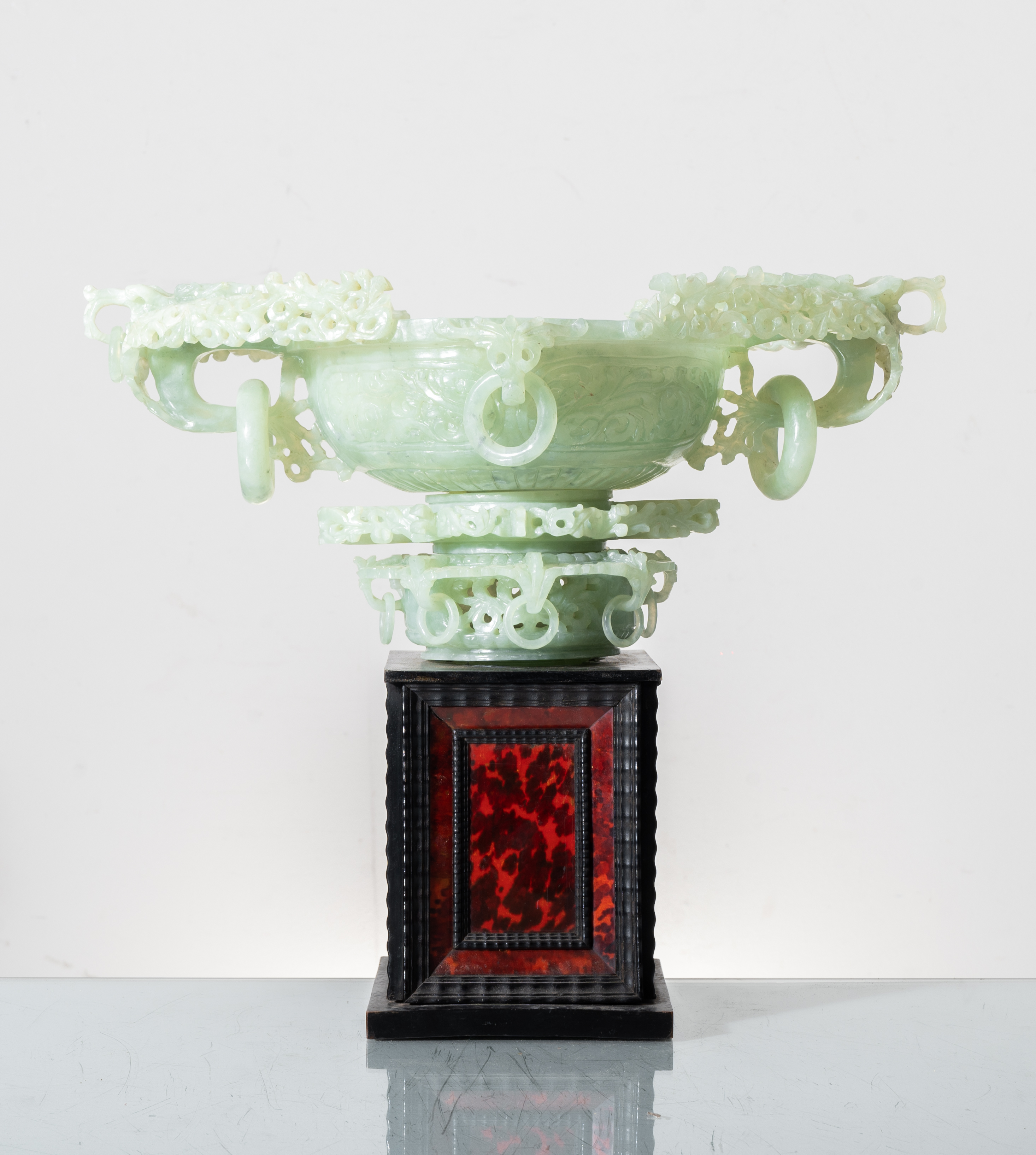 Centrotavola in giada riccamente lavorato (usure e mancanze).