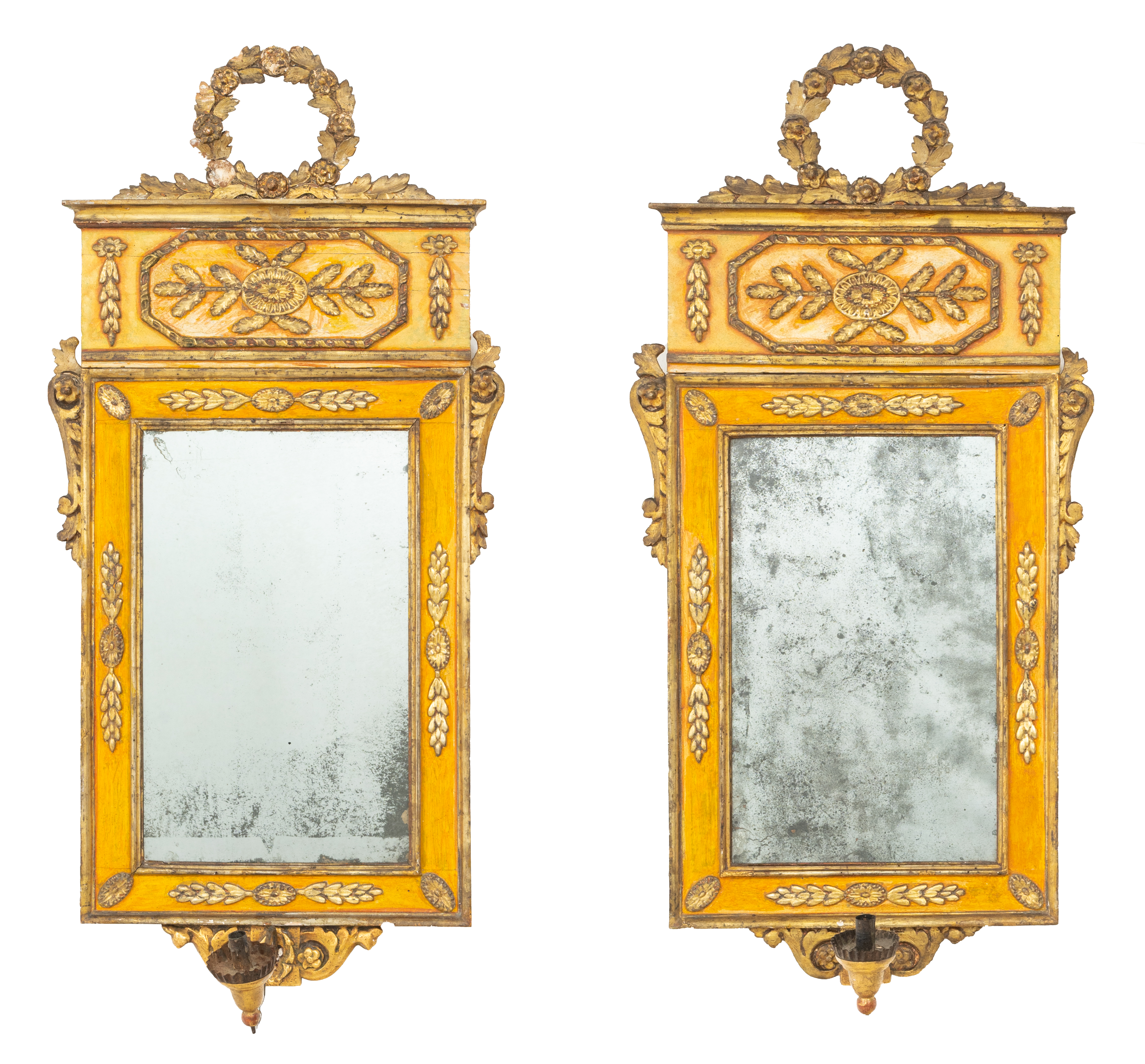 Coppia di specchiere stile Luigi XVI in legno laccato e dorato con applique porta candele.