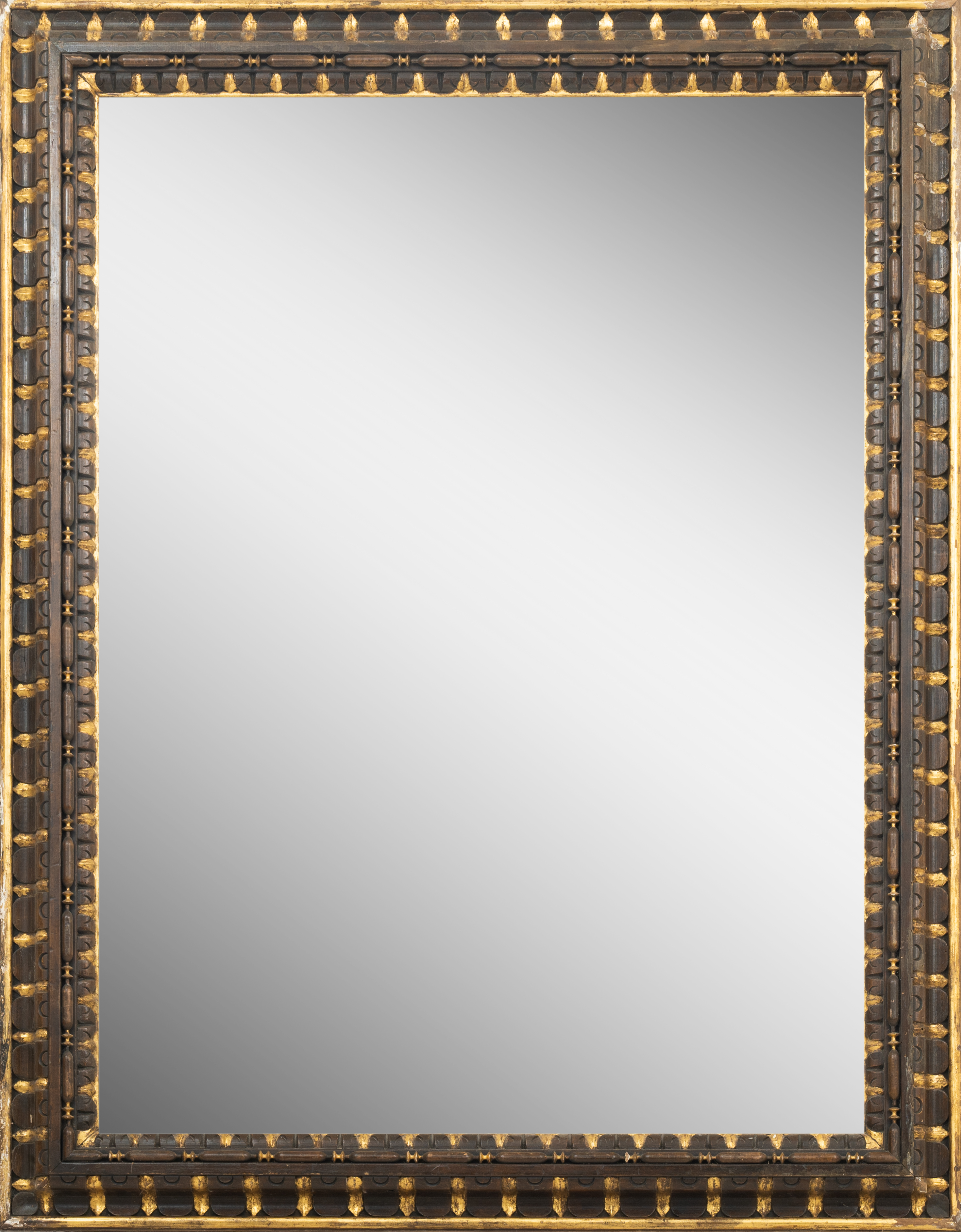 Specchiera in legno di noce con bordure dorate.