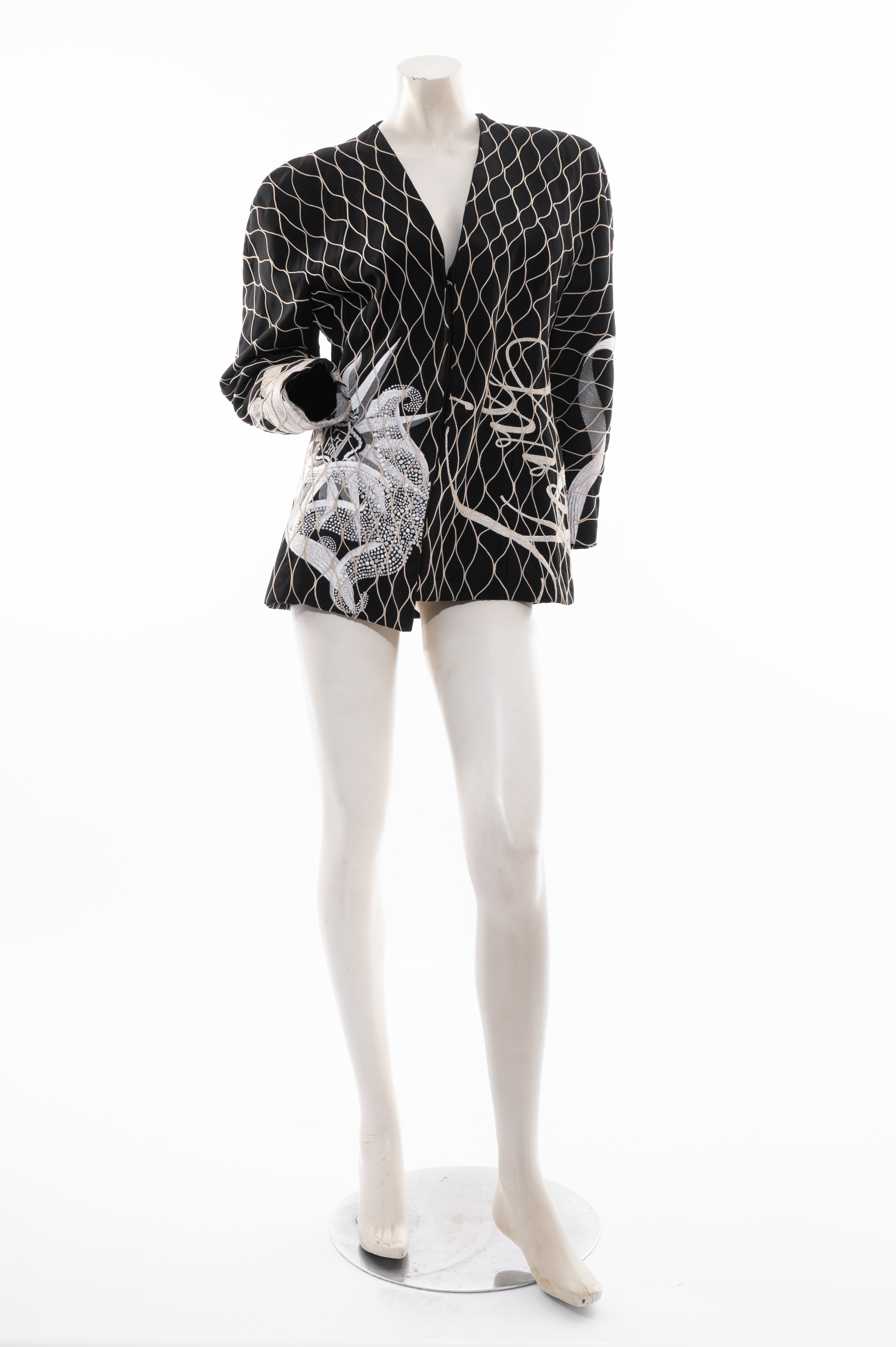 Giacca in tessuto di lana nero a maniche lunghe, ricami a trama larga bianchi con decori floreali astratti, logo laterale, scollatura a” V” con abbottonatura frontale. Taglia 42. Marchio di produzione.
