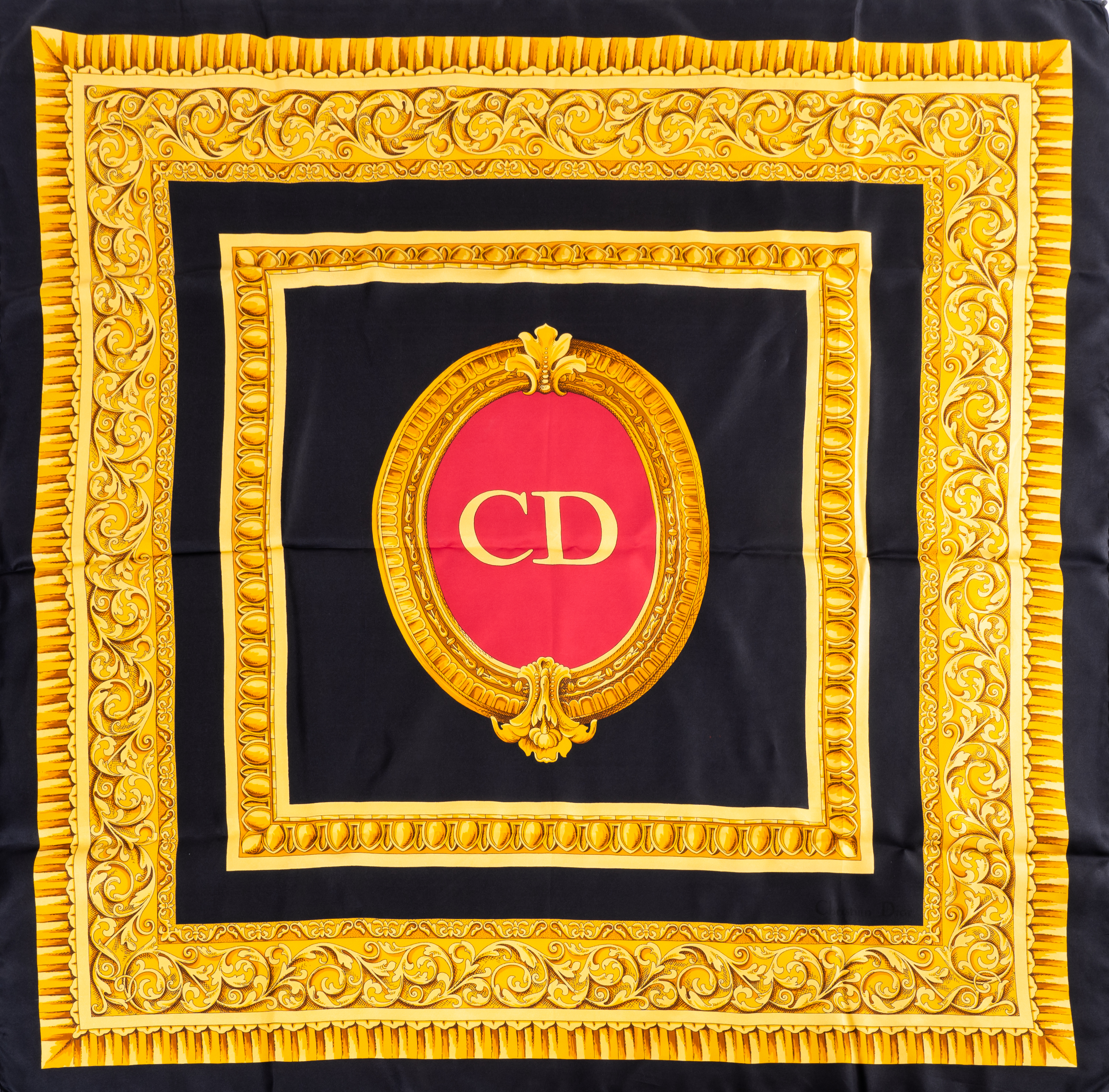 Foulard in seta a campo nero con decori a cornice in oro, centrale ovale nei toni del rosso con monogramma Dior. Segni di uso ed un filo tirato. Marchio di produzione.