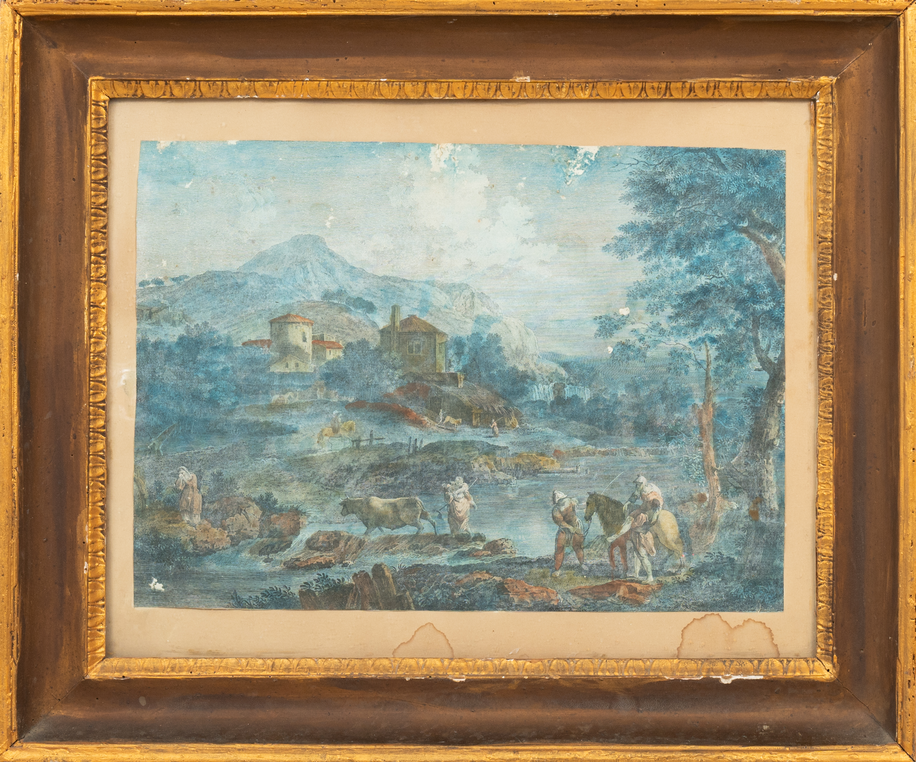 Cornice a mezza canna in legno dorata e brunito con all'interno stampa a colori raffigurante "Paesaggio".