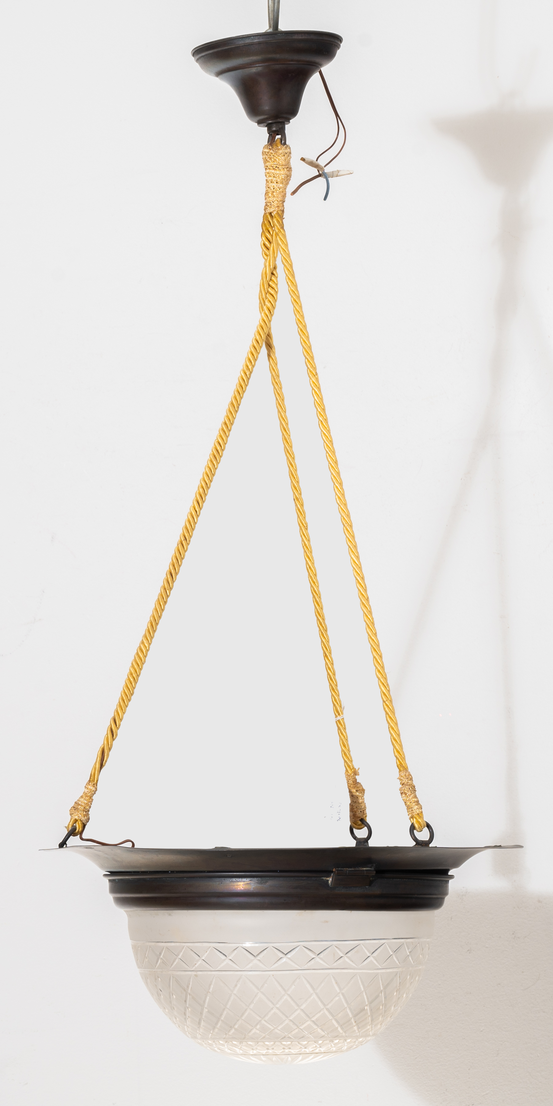 Lampadario ad una luce in ottone con boccia in vetro satinato.