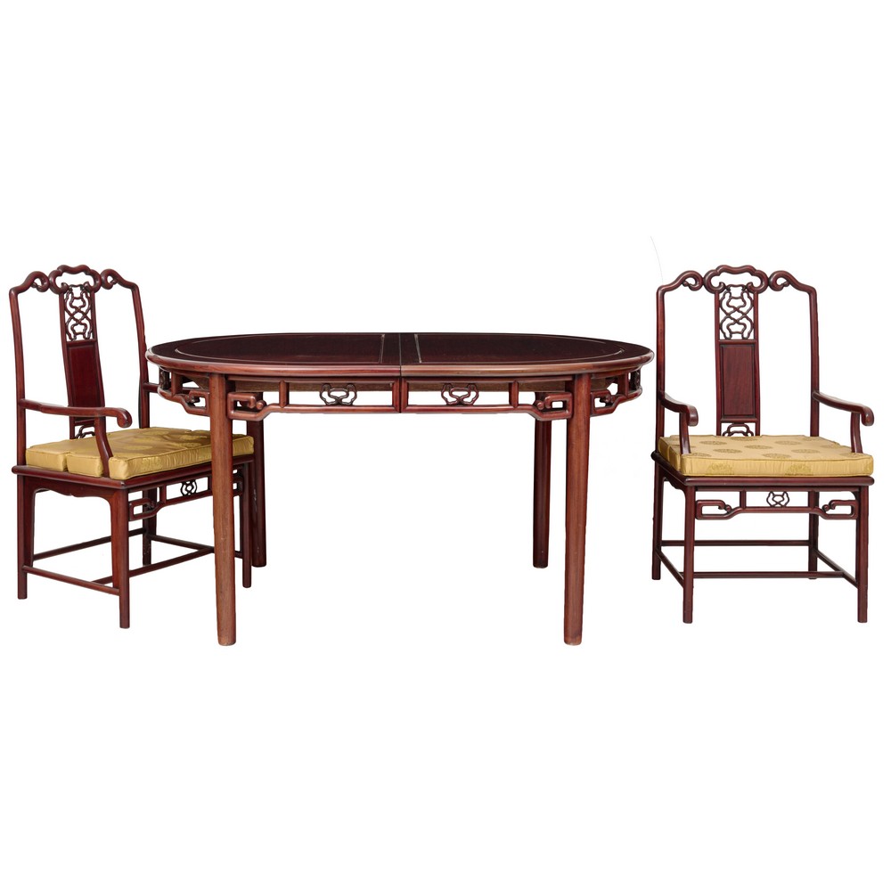 TAVOLO, DUE POLTRONE E SEI SEDIE in legno di mogano (due allunghi).