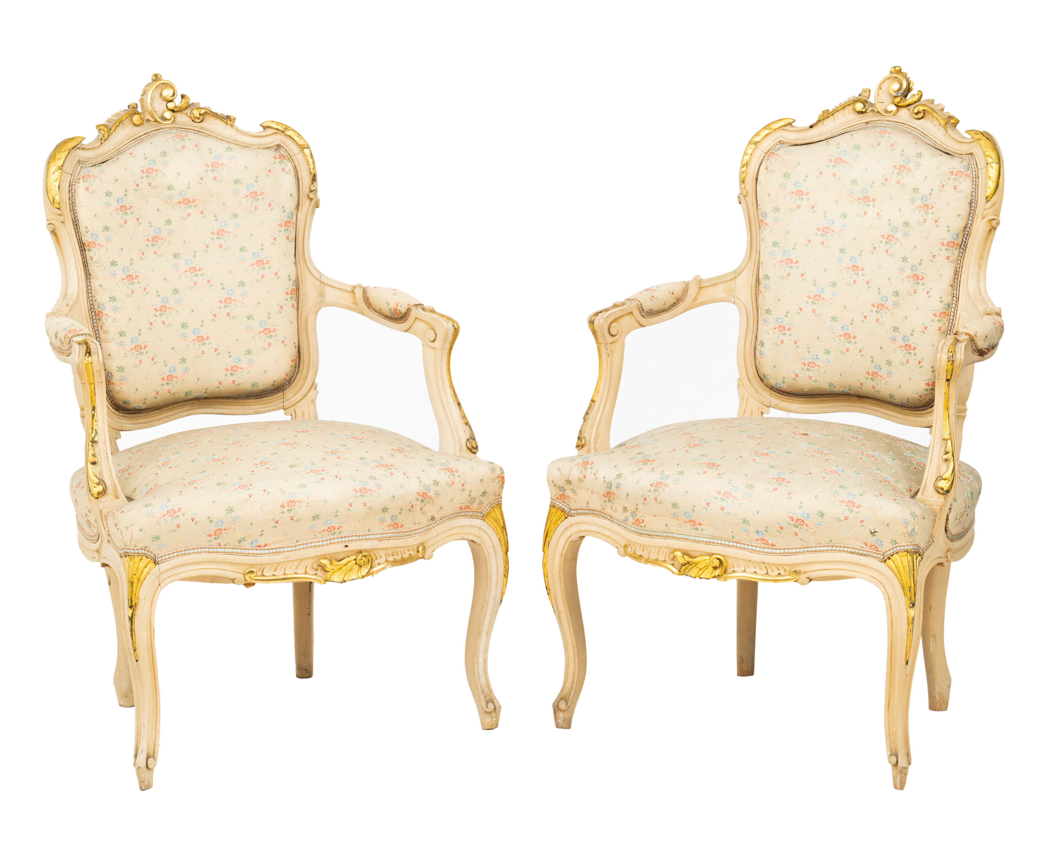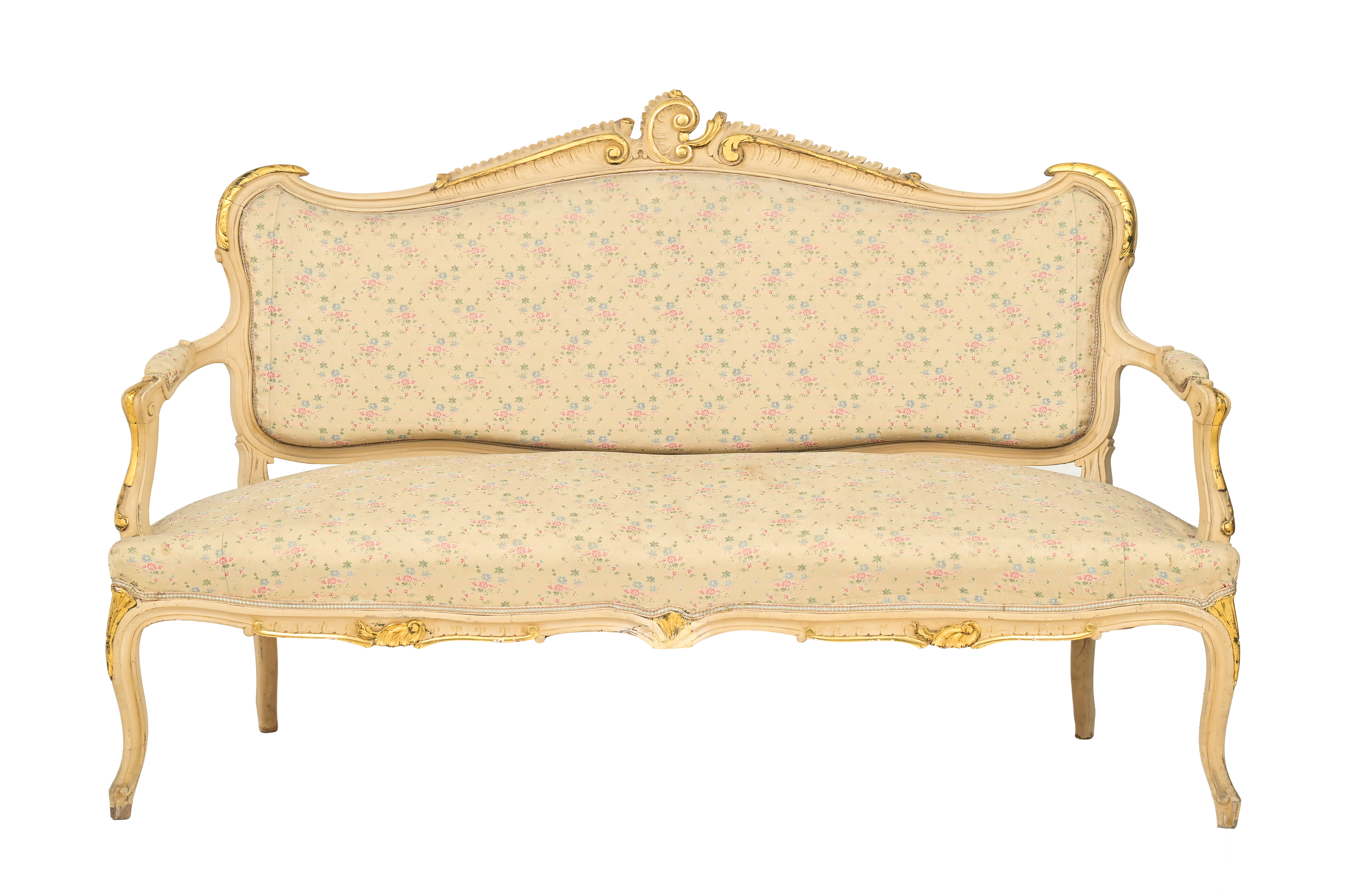 Divano e due poltrone stile Luigi XVI in legno dorato e laccato con tappezzeria decorata a motivo floreale.