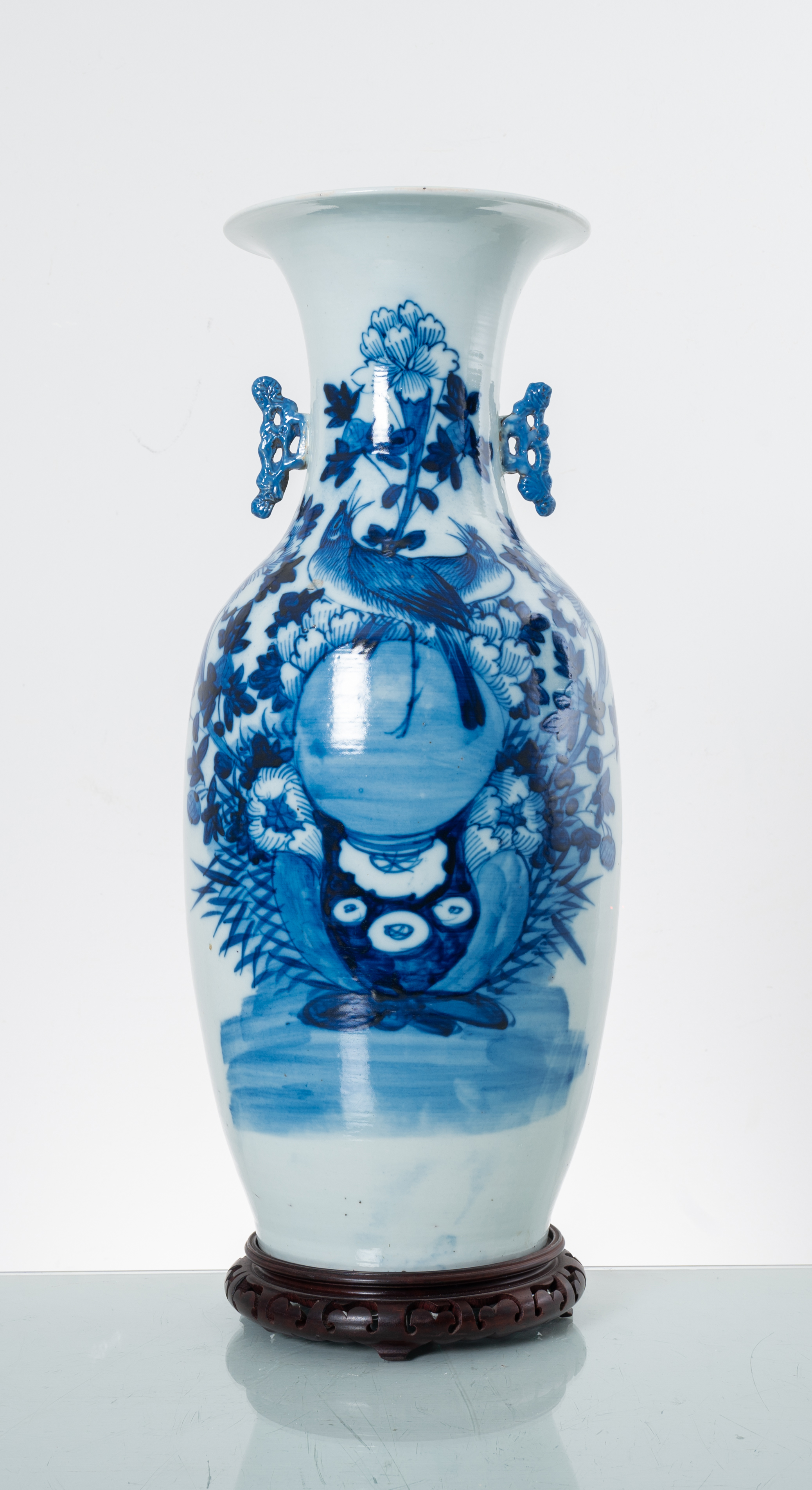 Vaso in porcellana bianca decorata nei toni del blu a motivo naturalistico.