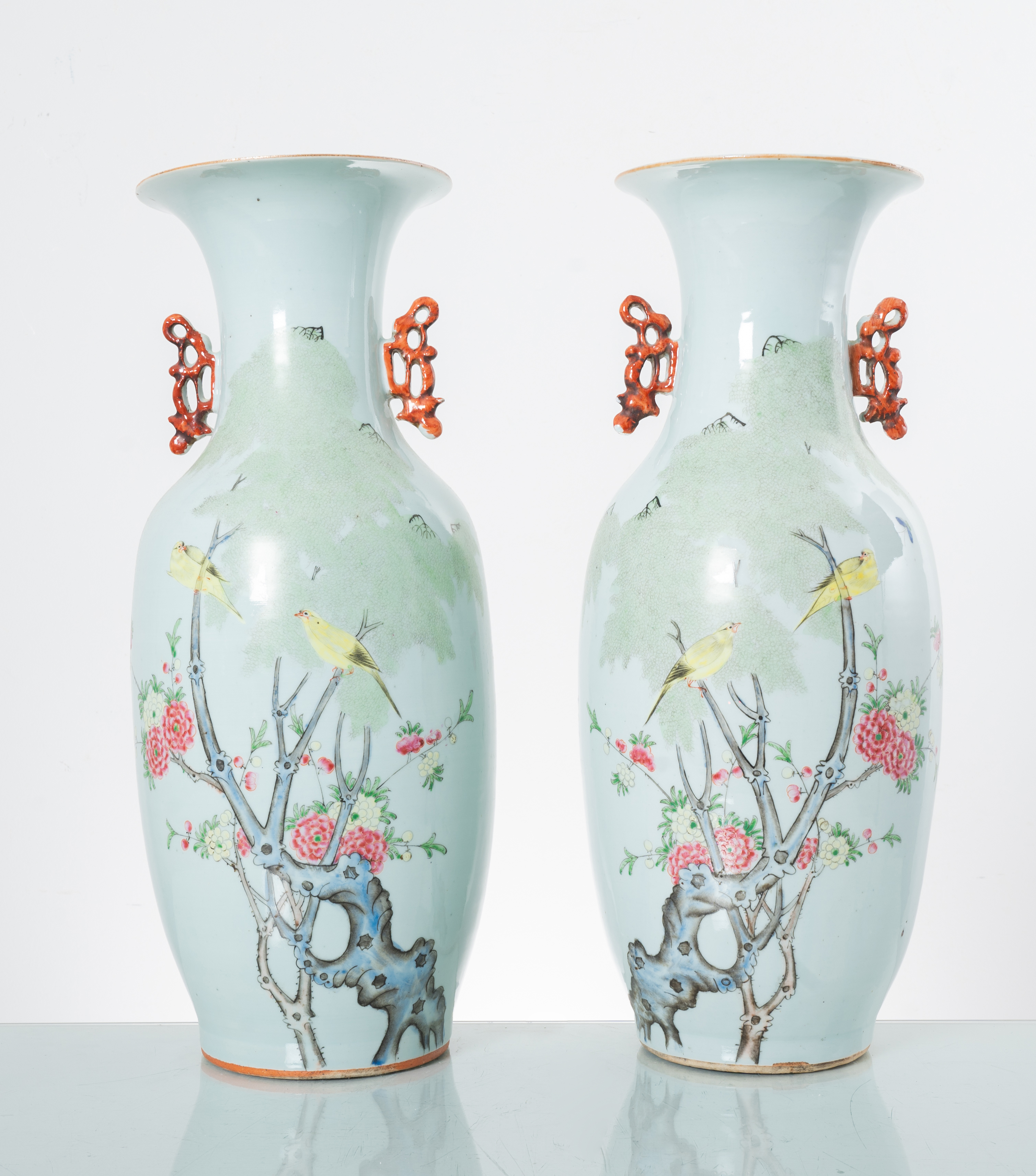 Coppia di vasi in porcellana decorati a motivo naturalistico.