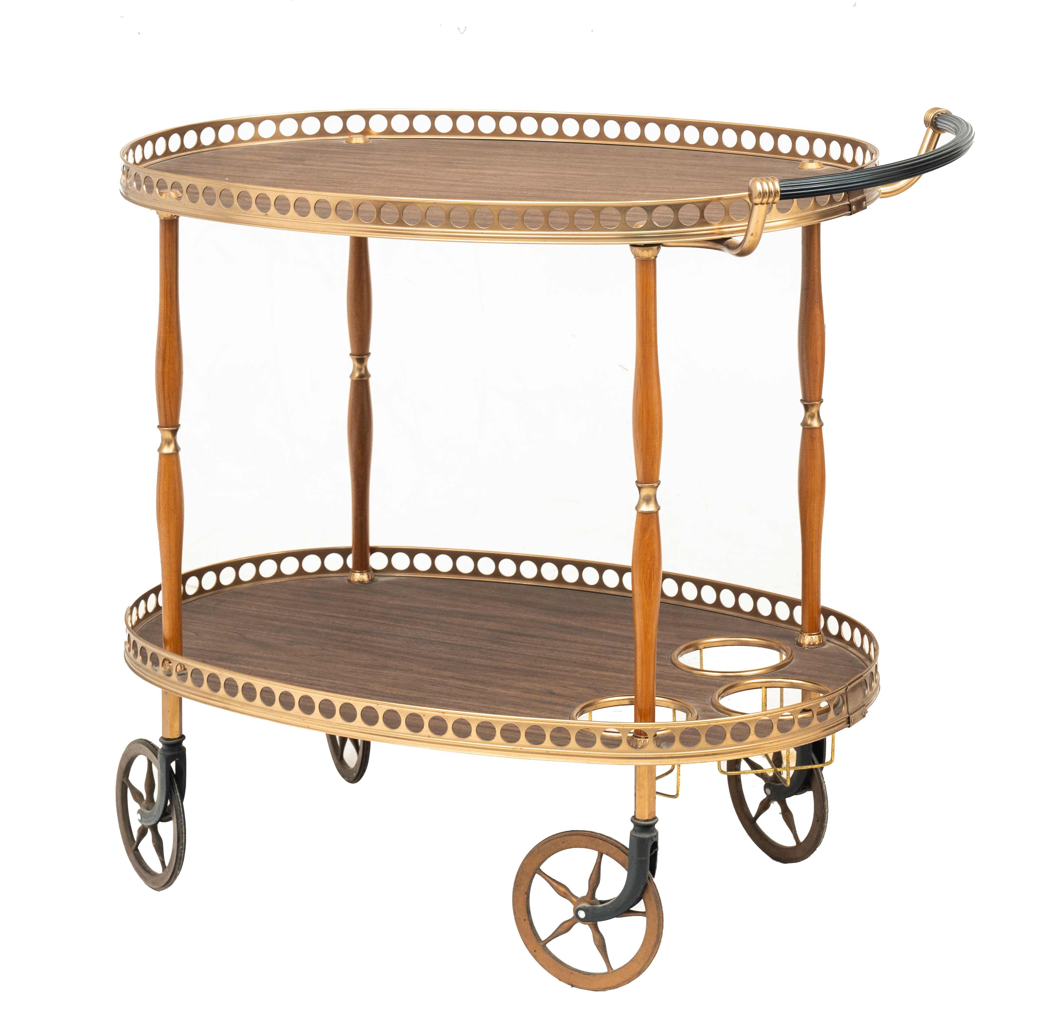 CARRELLO porta bibite di forma ovale in legno e ottone.