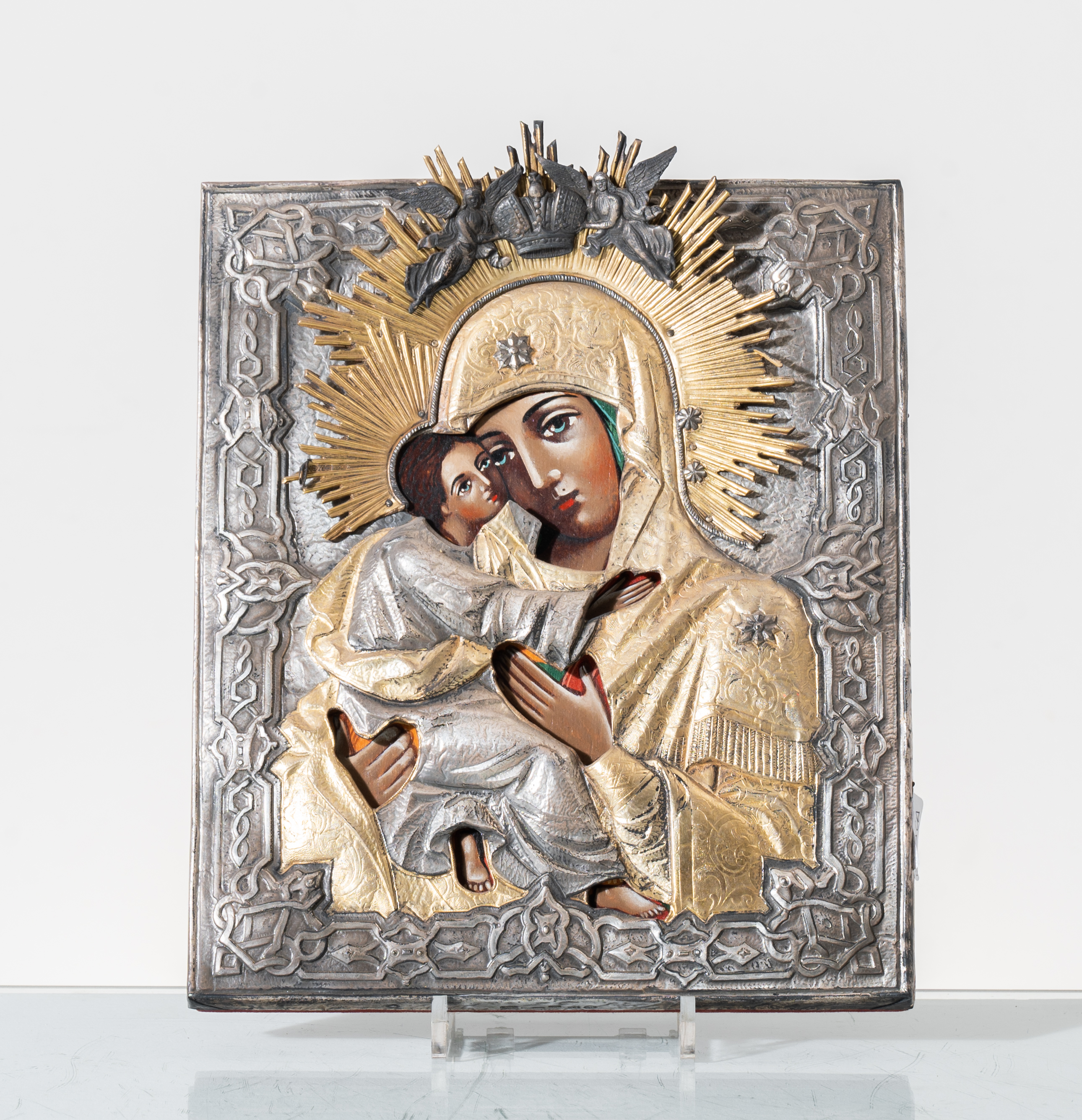 Icona con riza in argento raffigurante "La Madonna con Bambino".