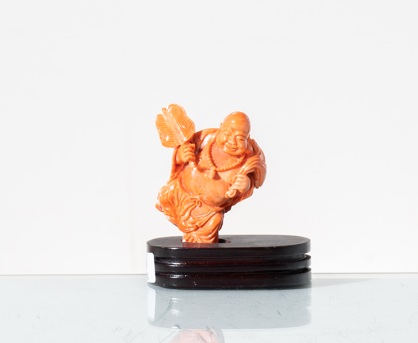 Scultura in corallo raffigurante "Figura con ventaglio" con base in legno.