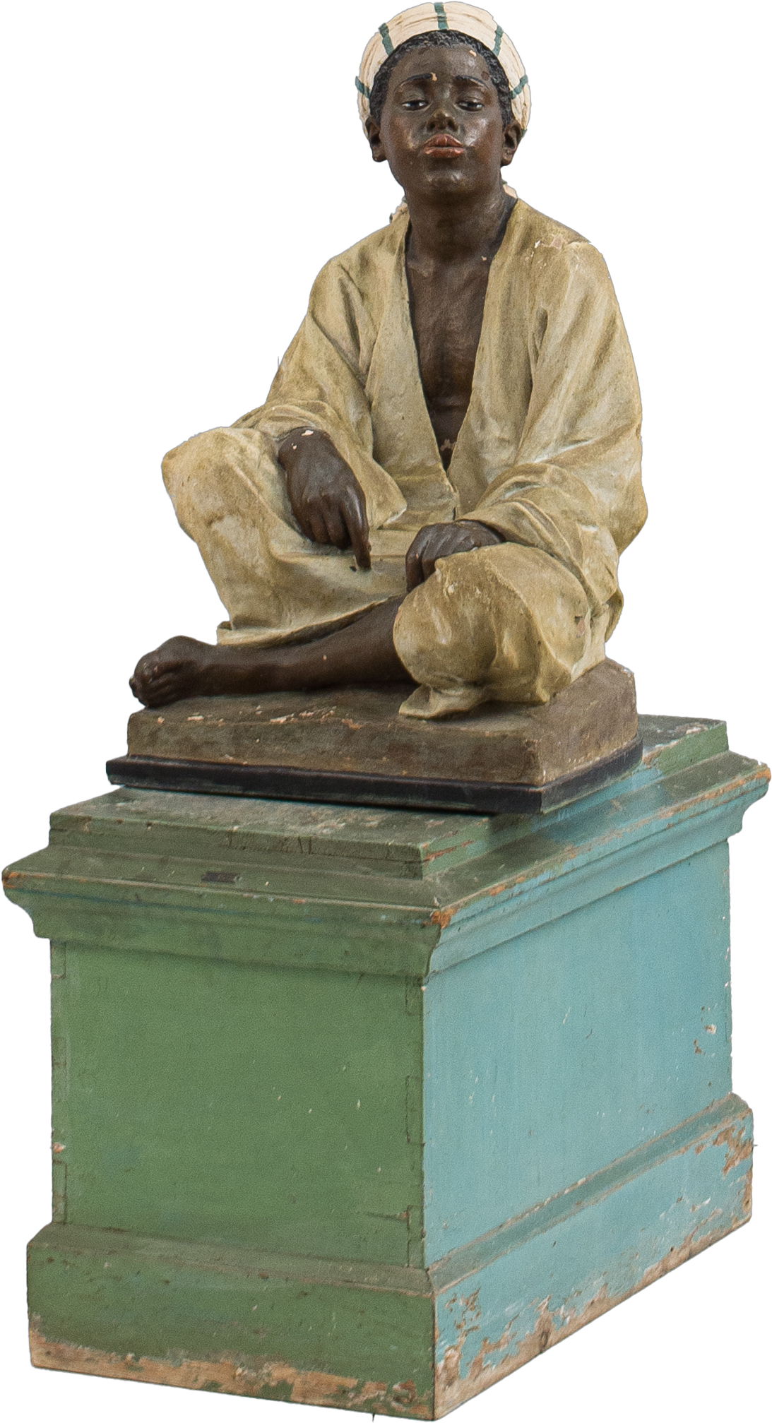 Scultura in terracotta policroma raffigurante "Ragazzo Arabo seduto" con base in legno laccato.