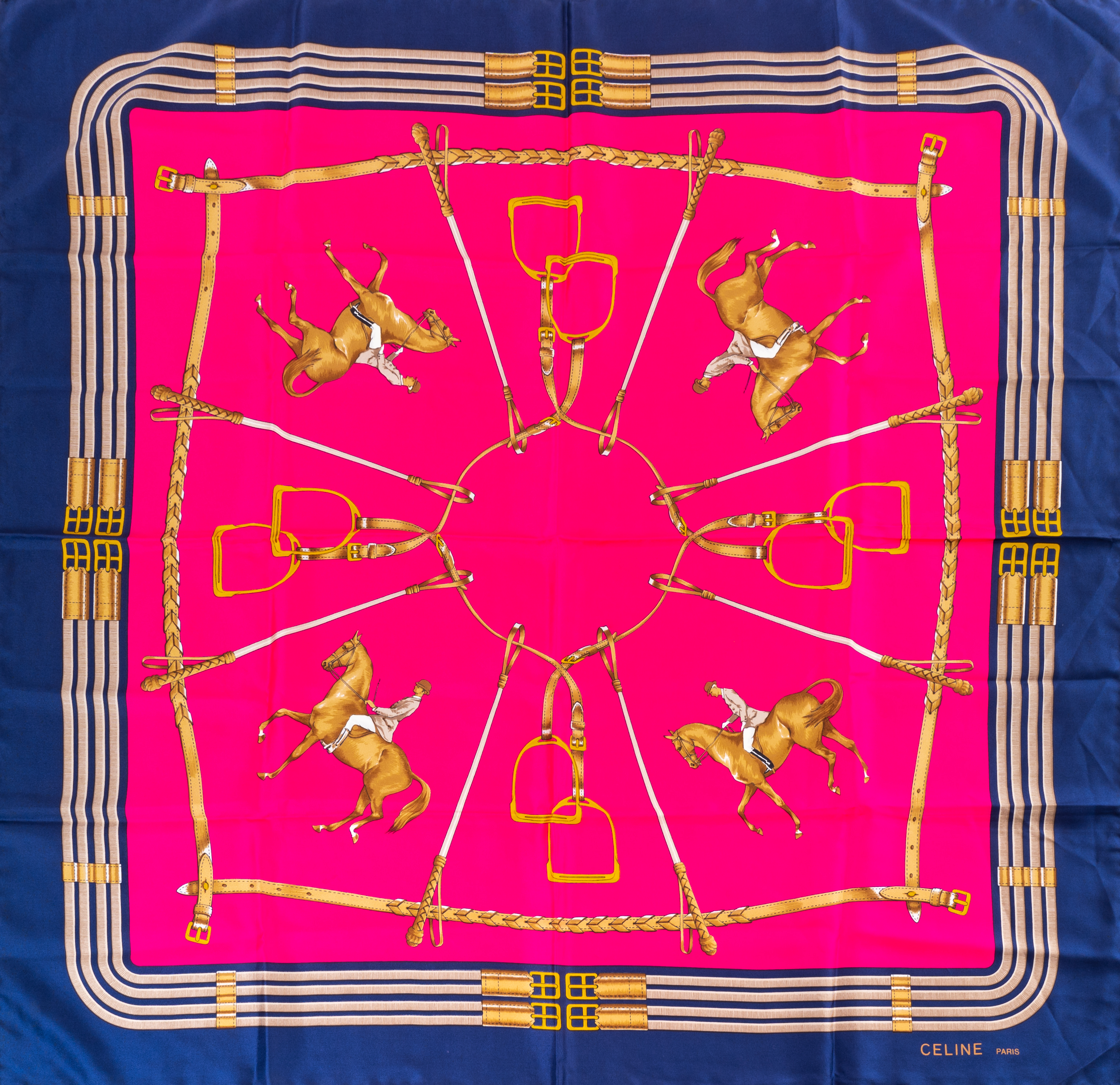 Foulard in seta a fondo fuxia con scene e temi equestri, bordo blu. Marchio di produzione.