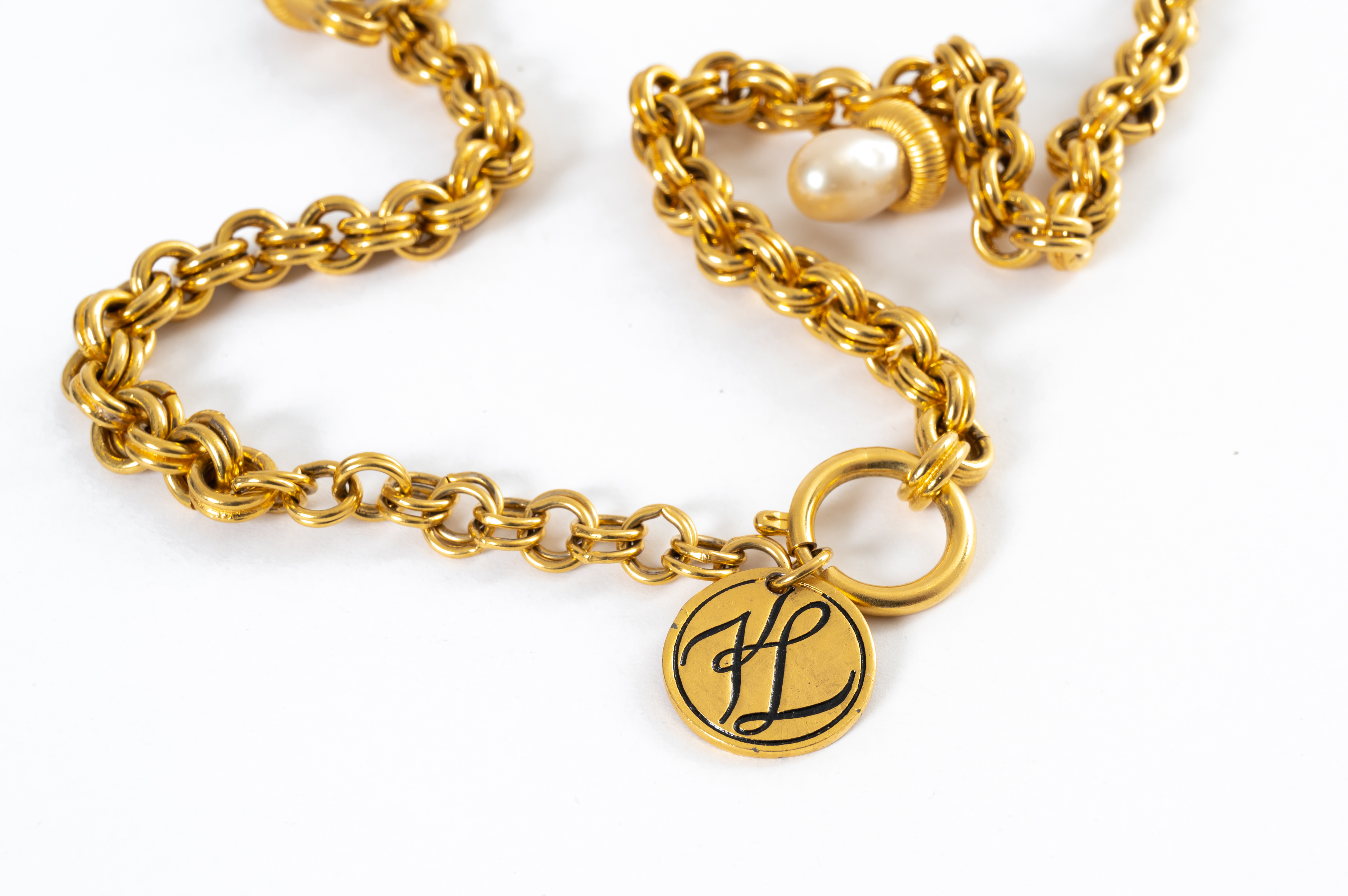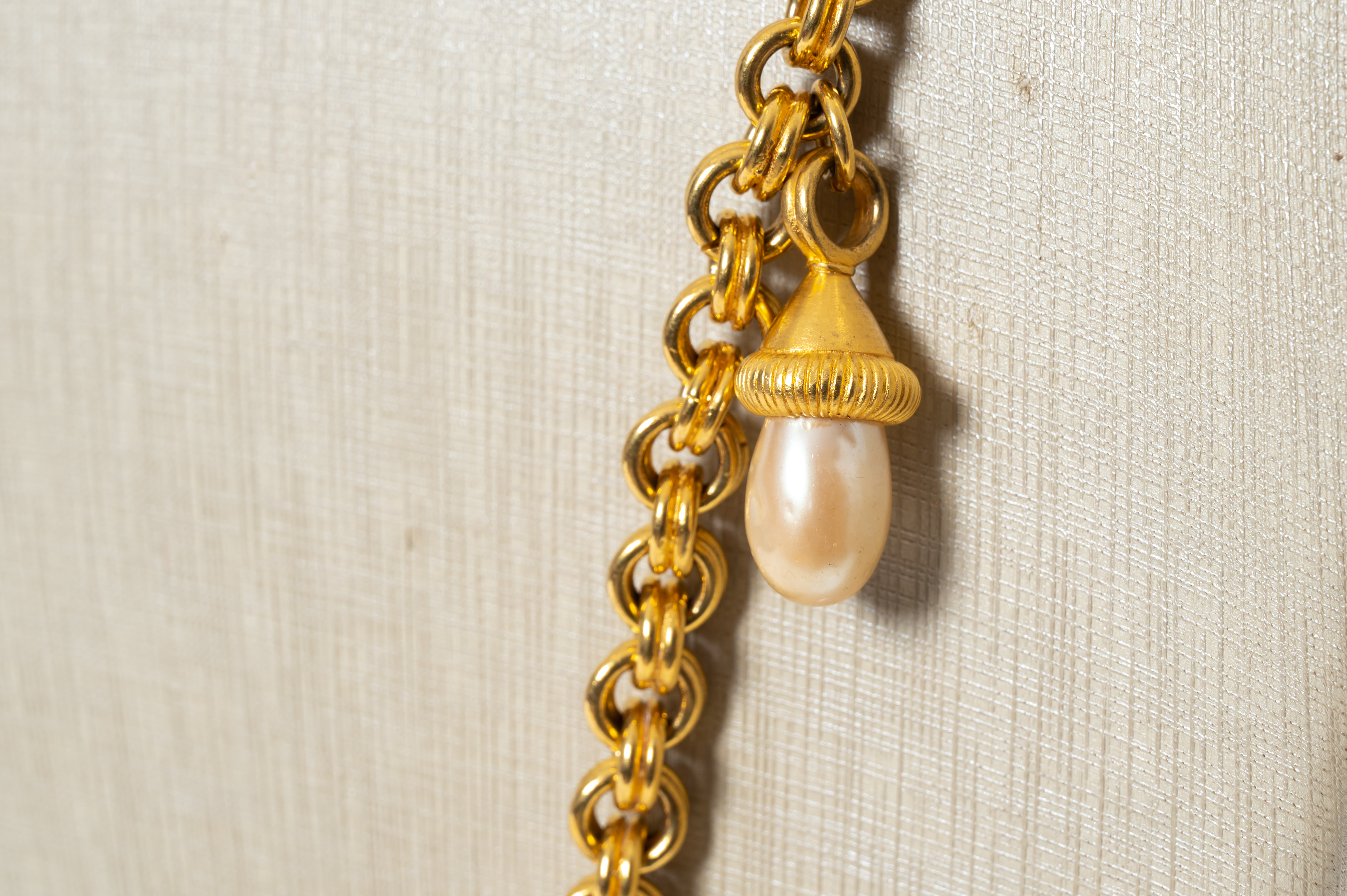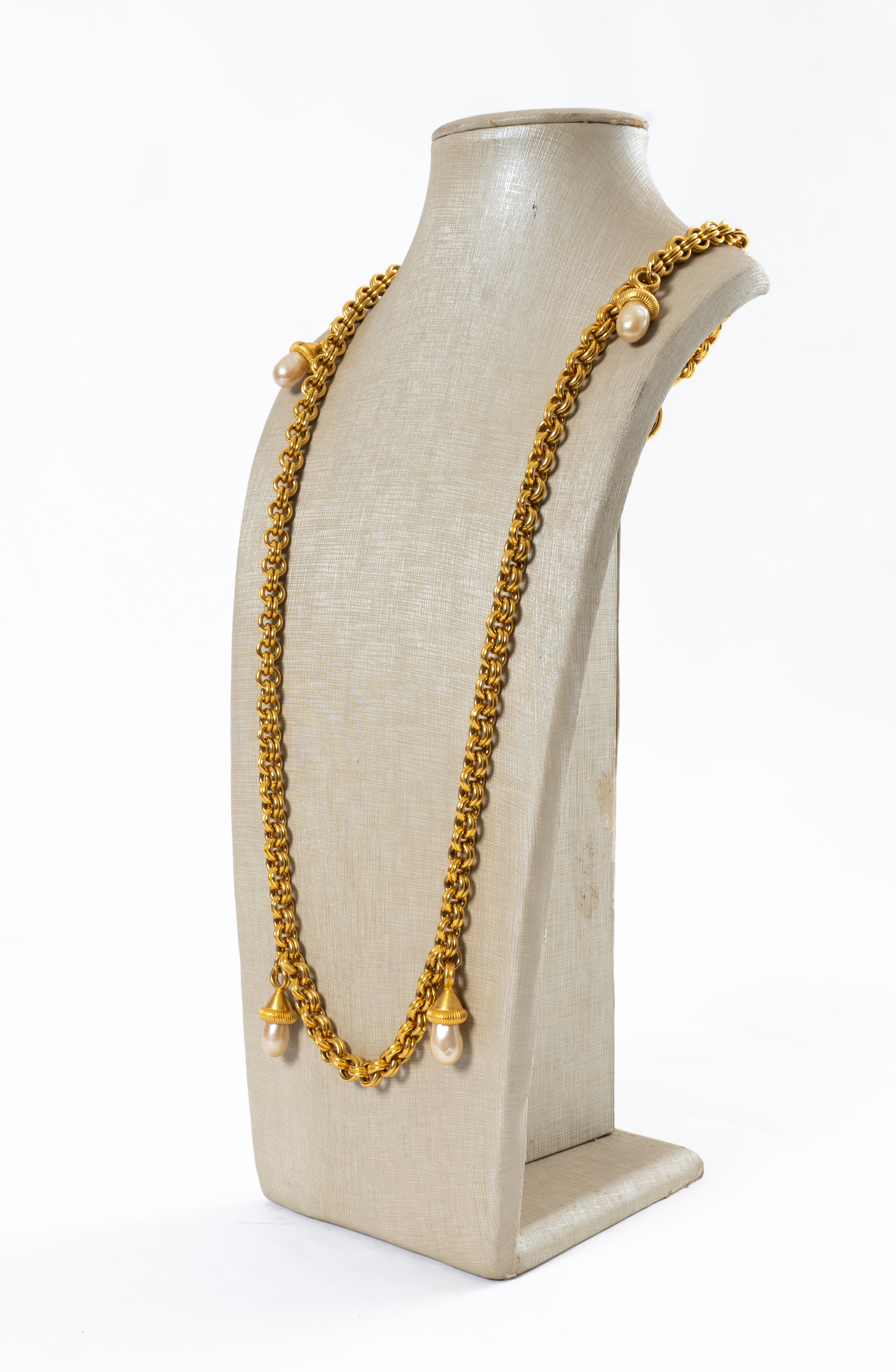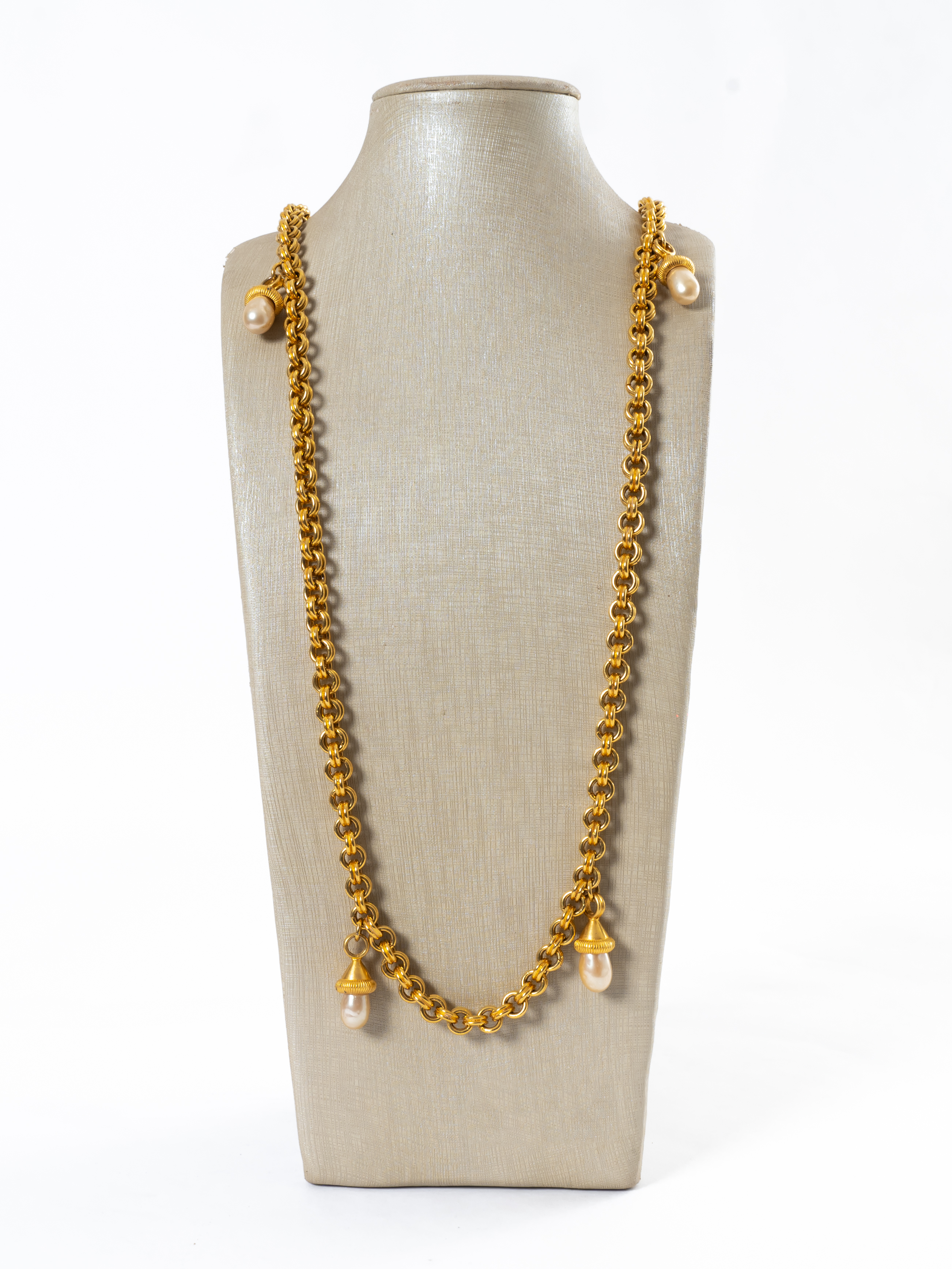 Lunga collana con maglie ad anelli in metallo dorato, pendenti in metallo dorato con perle a goccia, chiusura a moschettone circolare, moneta con marchio di produzione.