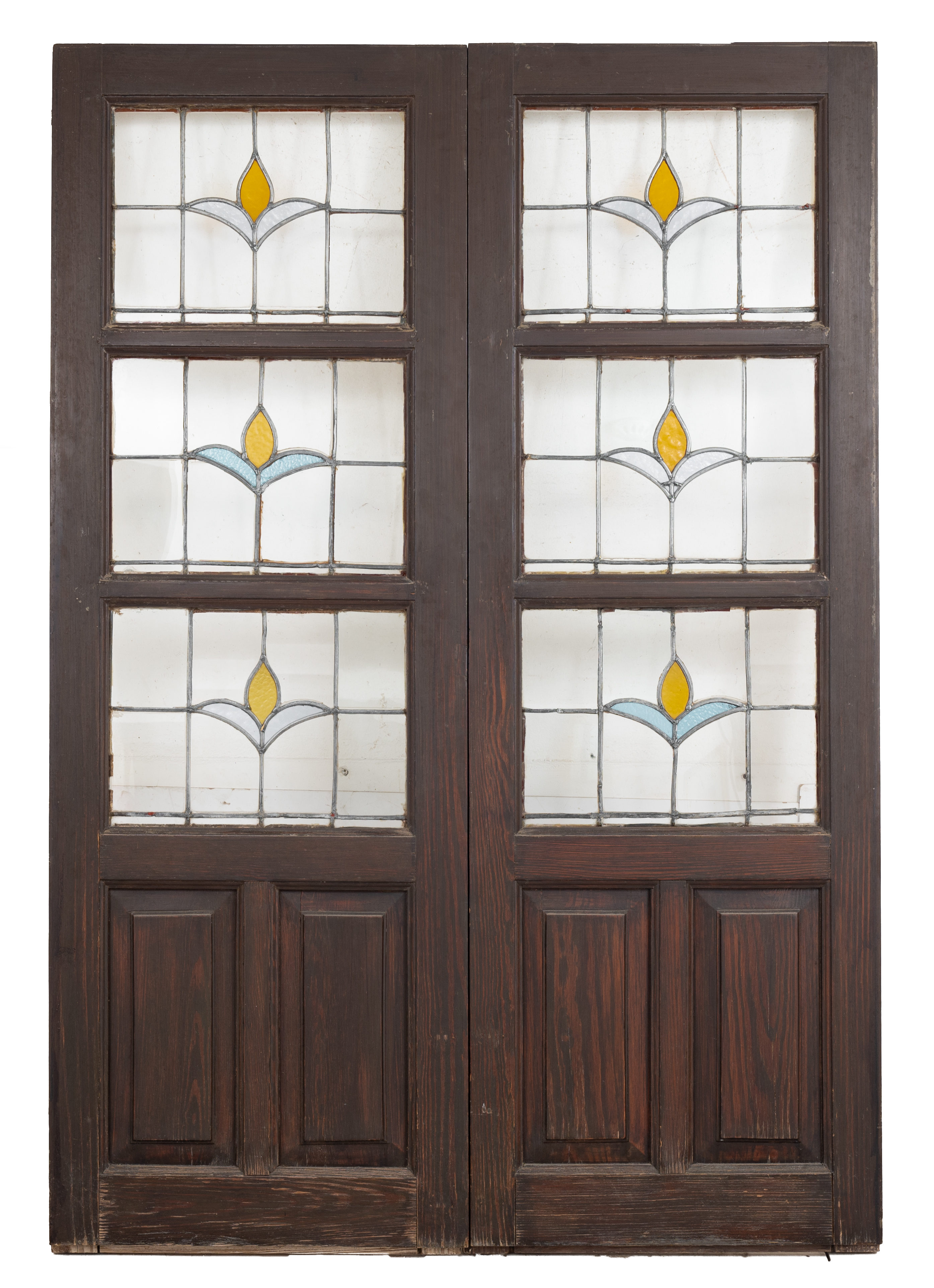 Coppia di porte in legno con vetri Liberty tipo cattedrale.