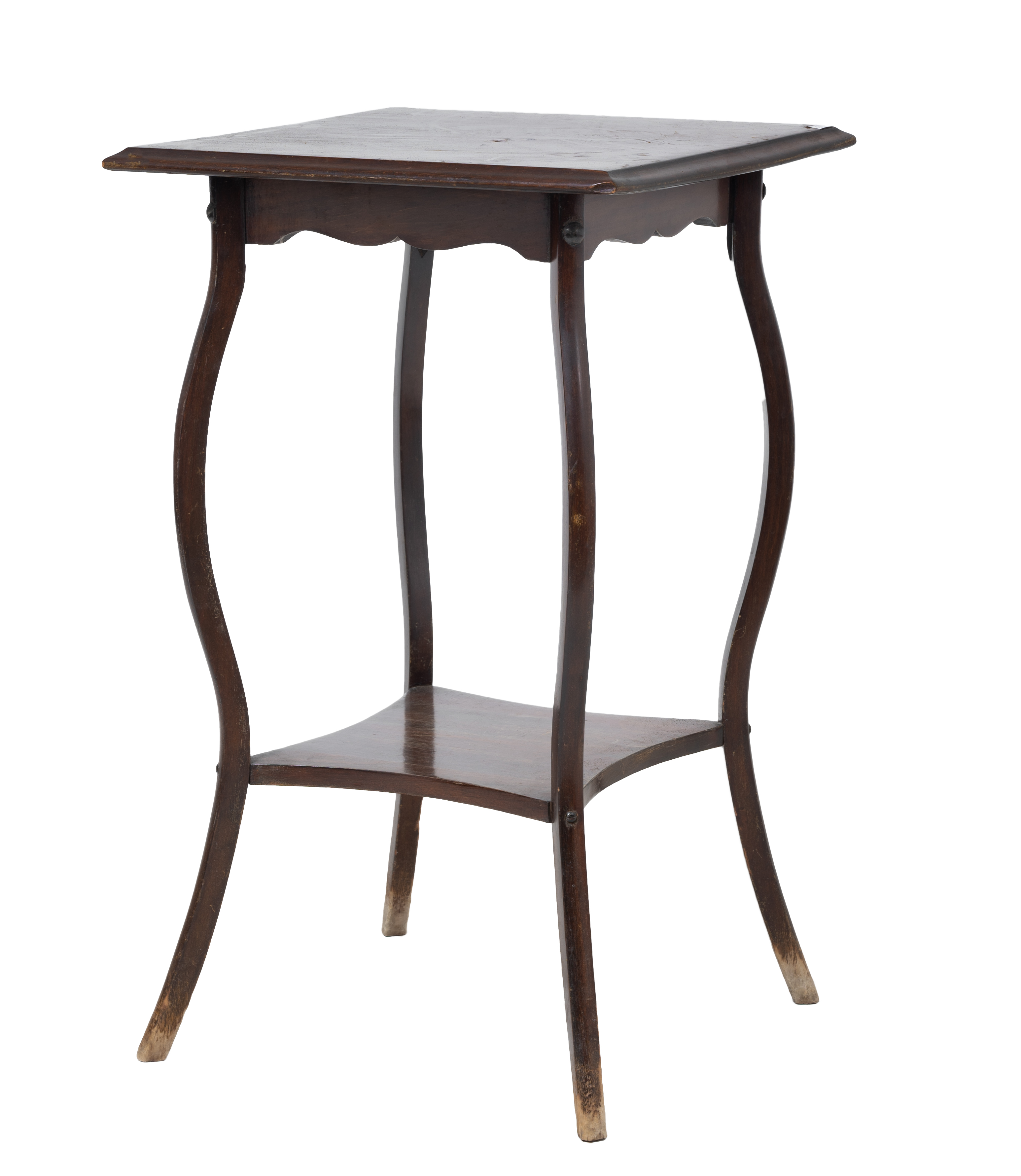 Tavolino di forma quadrata a due ripiani in legno di noce.